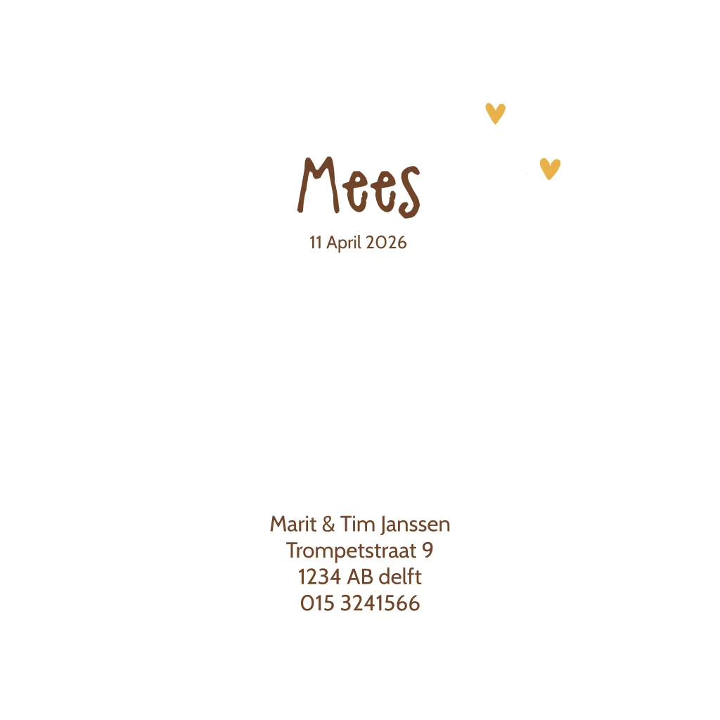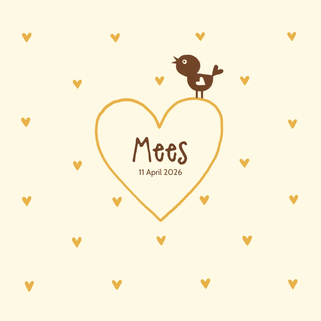 Een origineel, clean geboortekaartje voor een jongen met vogel op hart in bruin en oker. (3349)