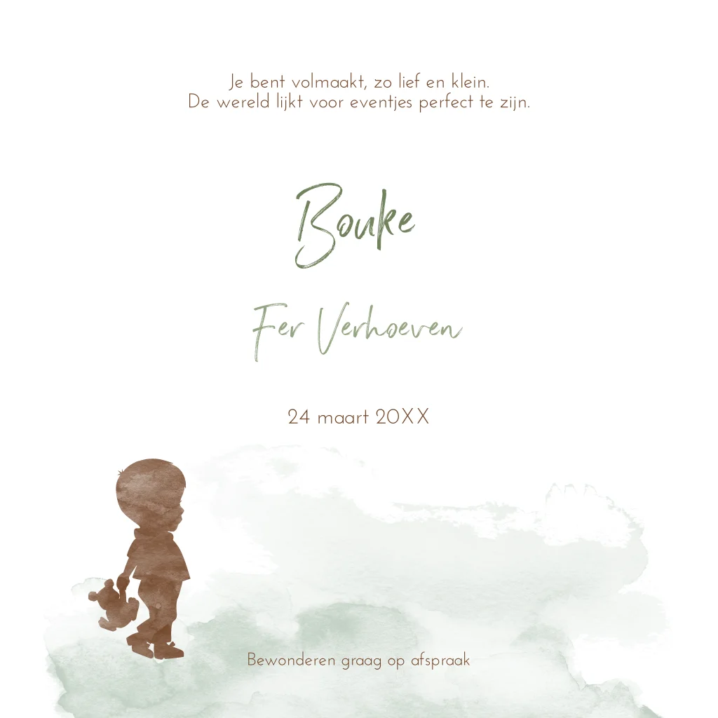In verwachting van een jongetje? Dit geboortekaartje met waterverf silhouet van drie kindjes en plantjes en takjes, kun je zelf aanpassen. Is het je eerste of tweede kindje of is de volgorde van jouw gezin anders, neem dan even contact met ons op. Dan kunnen wij het silhouet voor jullie aanpassen.
