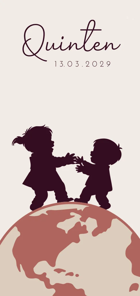 Een lief geboortekaartje met kindjes op een bruine aarde. Pas het ontwerp naar wens aan in onze editor.