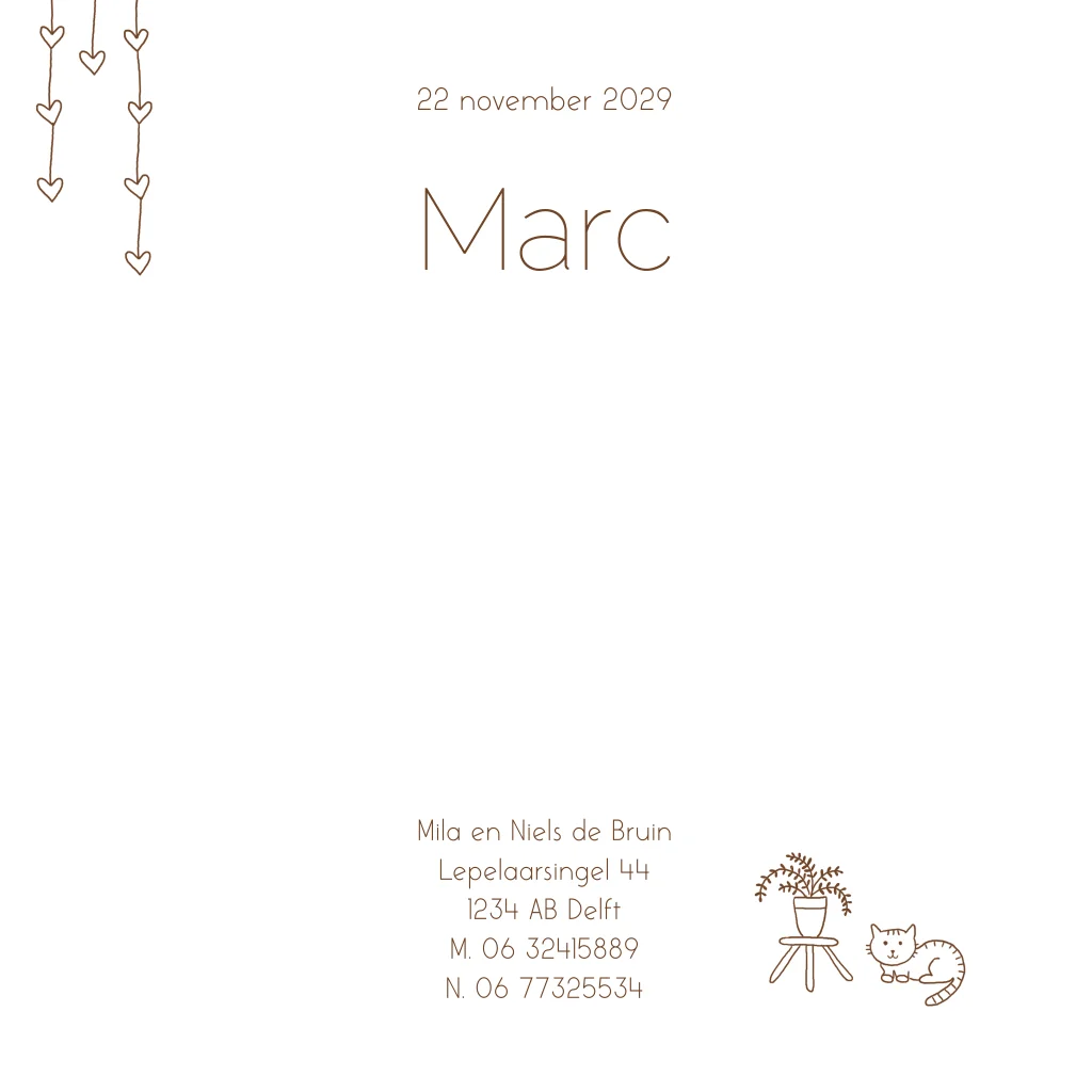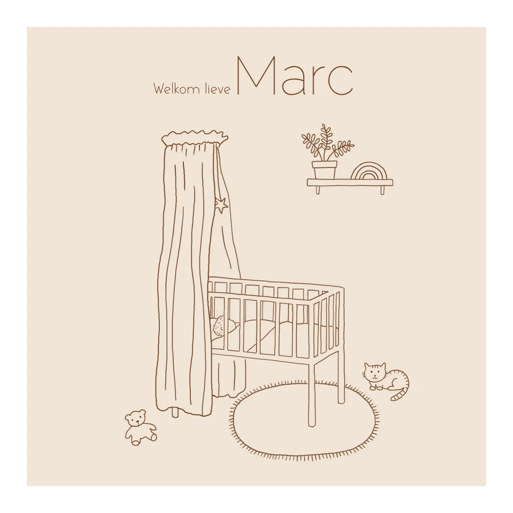 Een warm geboortekaartje voor een jongen met een zachte lijntekening van een baby in een wieg, samen met een katje en een lieve teddybeer. Pas het ontwerp eenvoudig aan naar eigen wens in onze online editor. Uit de speciale huisdieren collectie 'Thuis is met jou 🐾.