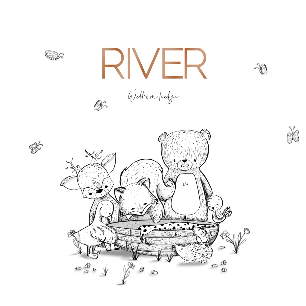 Lief getekend geboortekaartje met dieren om een wiegje. Hertje, vos, beer en eend. (4529)