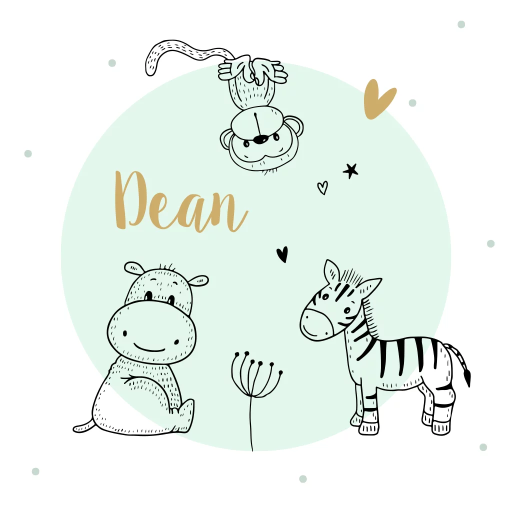 Getekend geboortekaartje jongen met safari dieren, aap, nijlpaard en zebra. Mint groene achtergrond. (3908)