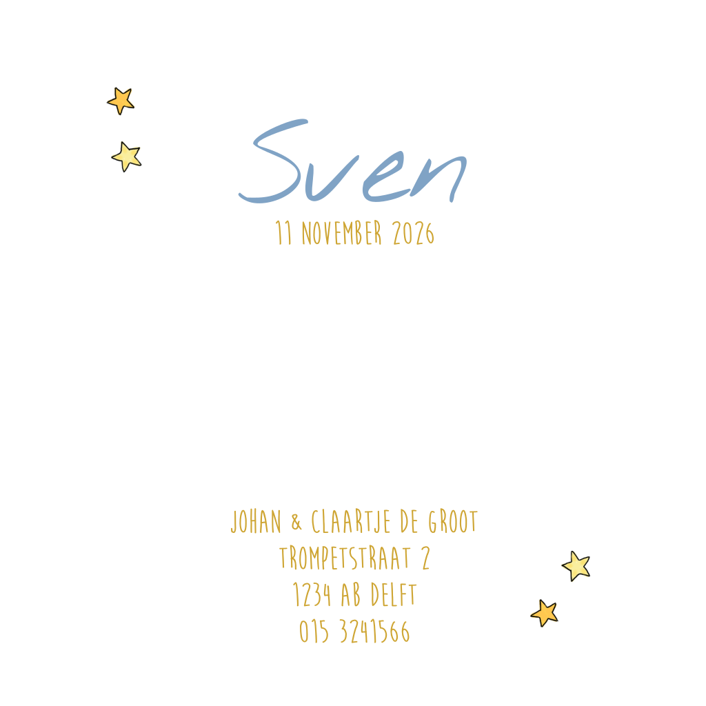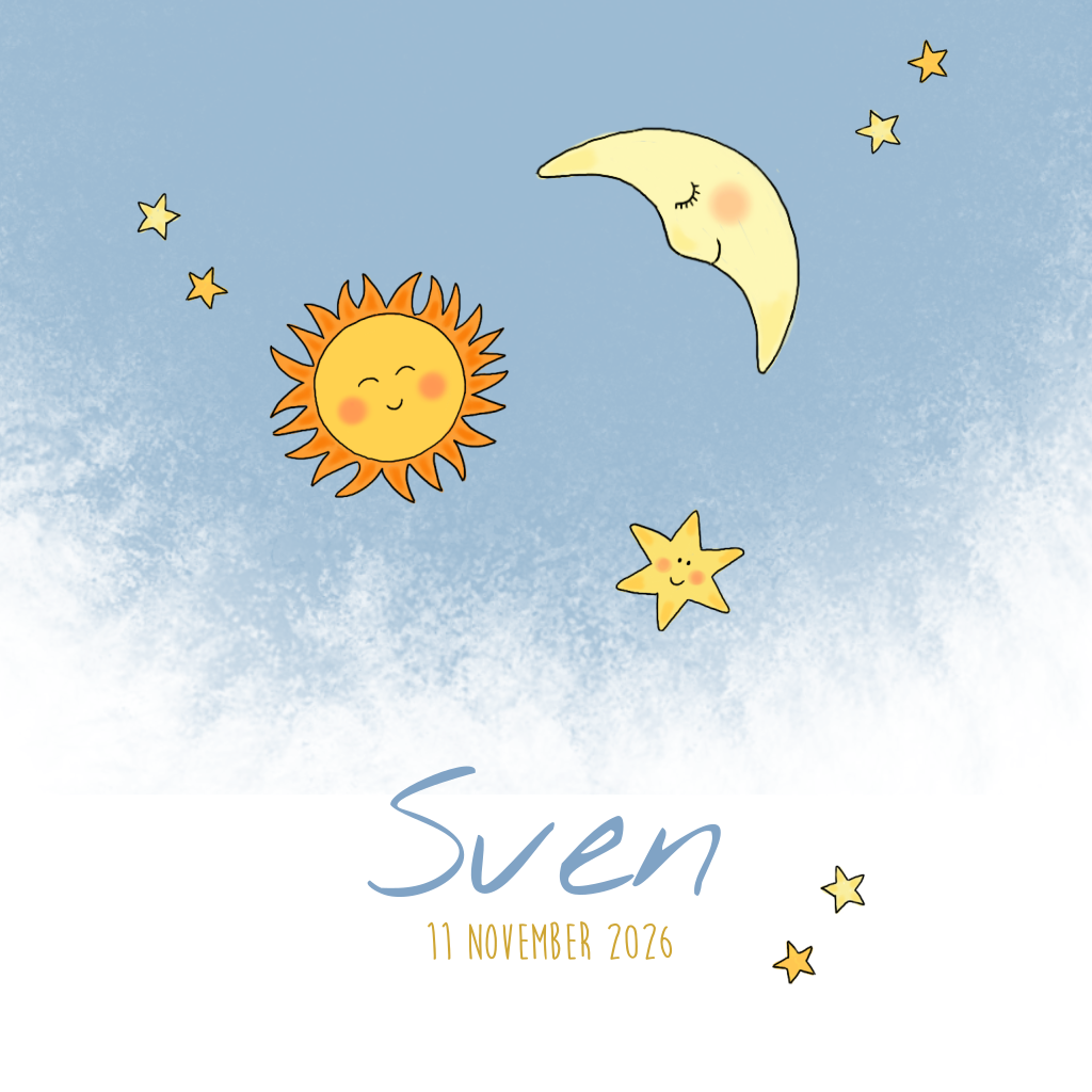 Een hip geboortekaartje voor een jongen met zon, maan en sterren op een blauw kleurverloop. (3326)