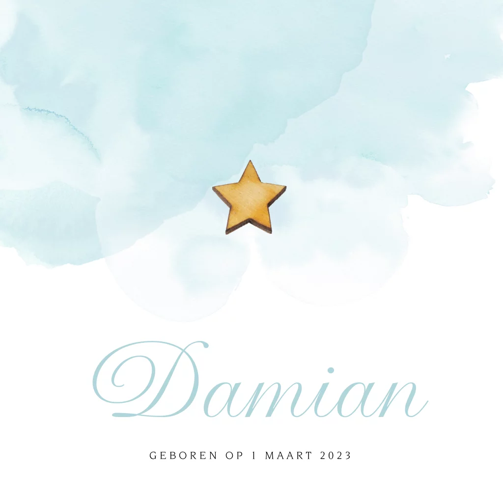 Hip geboortekaartje jongen met blauwe watercolor en houten ster