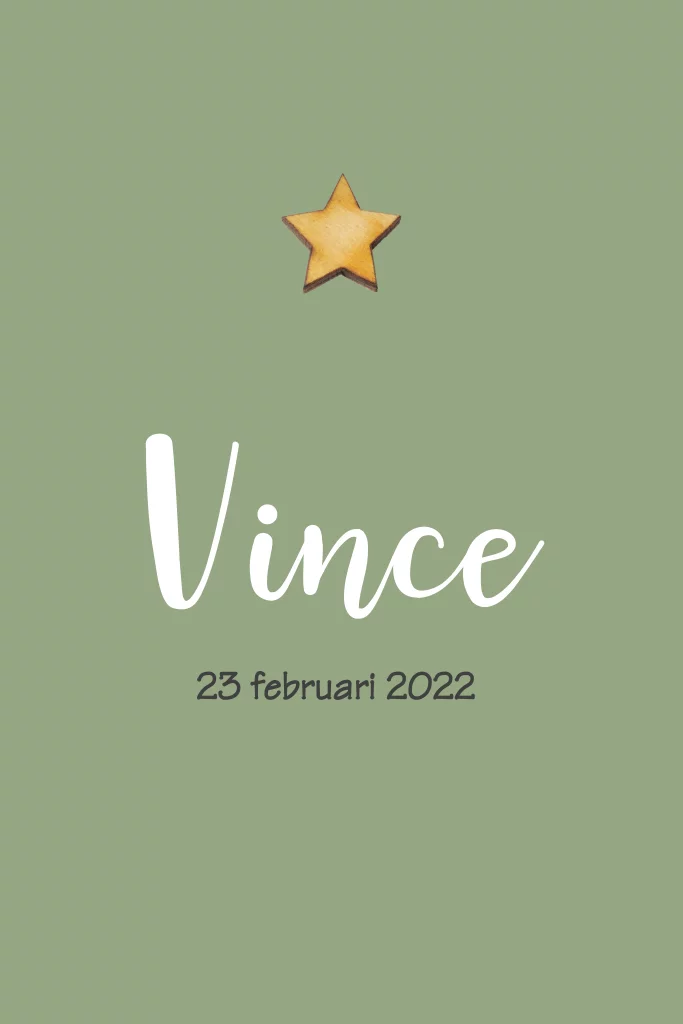 Stoer geboortekaartje met eenvoudig design met een Γ©cht houten hartje op een olijf groene achtergrond. De hippe typografie maken dit kaartje helemaal af!