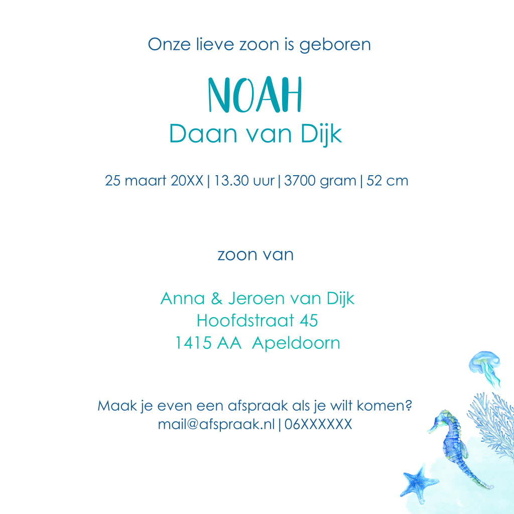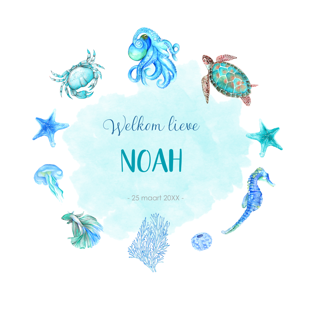 Geboortekaartje met leuke zeediertjes gemaakt in aquarel blauw. (4036)