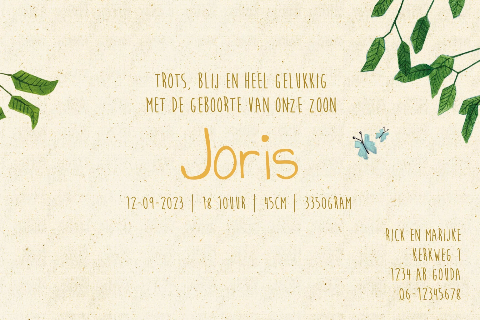 Geboortekaartje met illustratie van een lief leeuwtje zittend in de zon. Eromheen zijn allerlei planten en vlindertjes te zien. (3777)