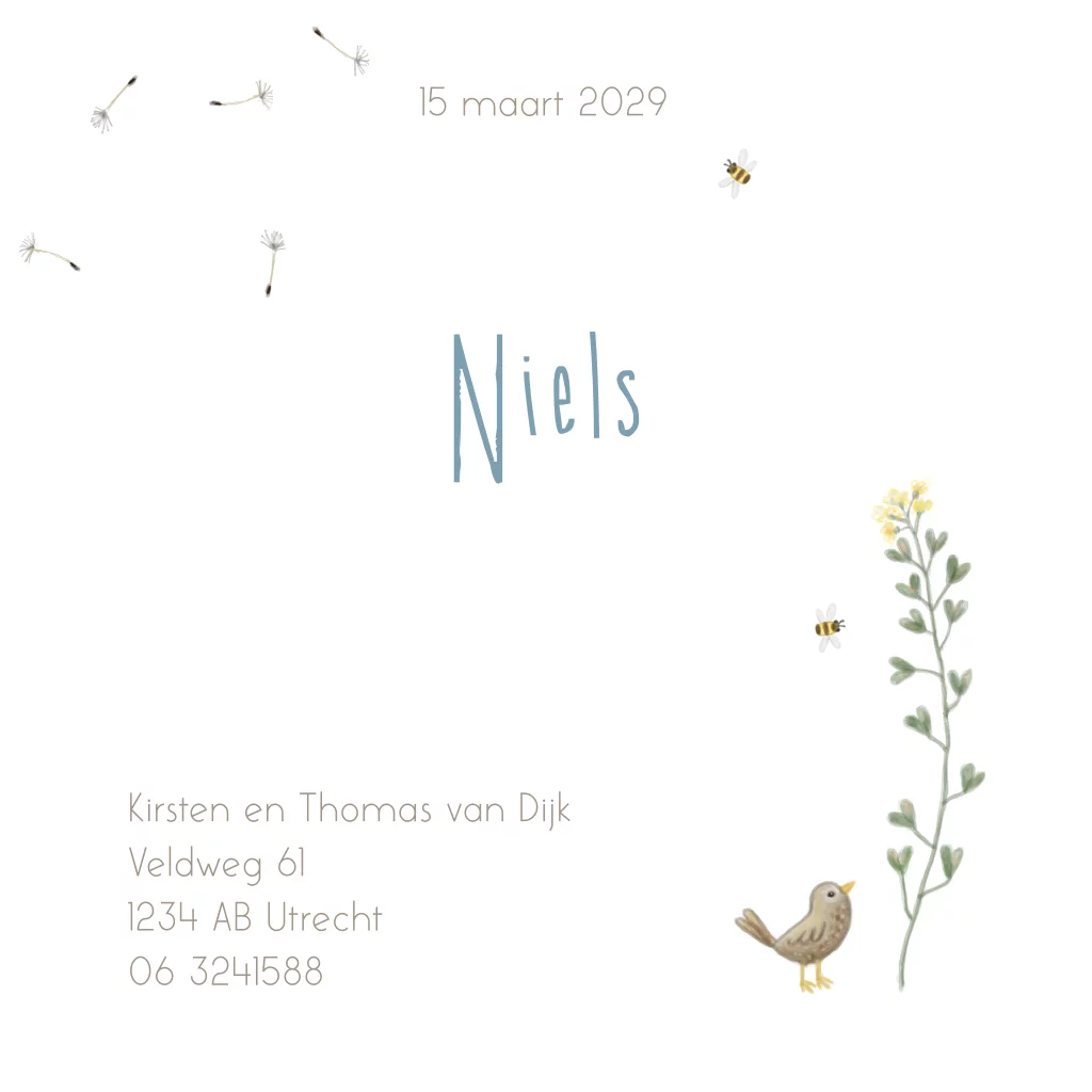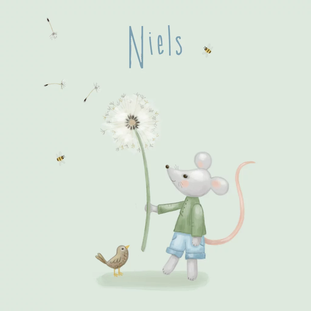 Een mooi lente geboortekaartje voor een jongen met muis met paardenbloem die pluisjes wegblaast. Met leuke details, zoals de bijtjes en de vogel