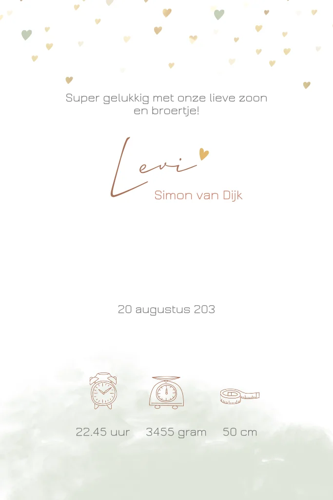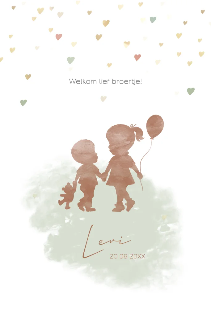 Een aquarel geboortekaartje met een silhouet van een jongetje hand in hand met zijn grote zus en dwarrelende hartjes. De kleuren kun je zelf eenvoudig aanpassen in onze online editor. Wil je dat niet of heb je liever een ander formaat, neem dan gerust even contact met ons op.