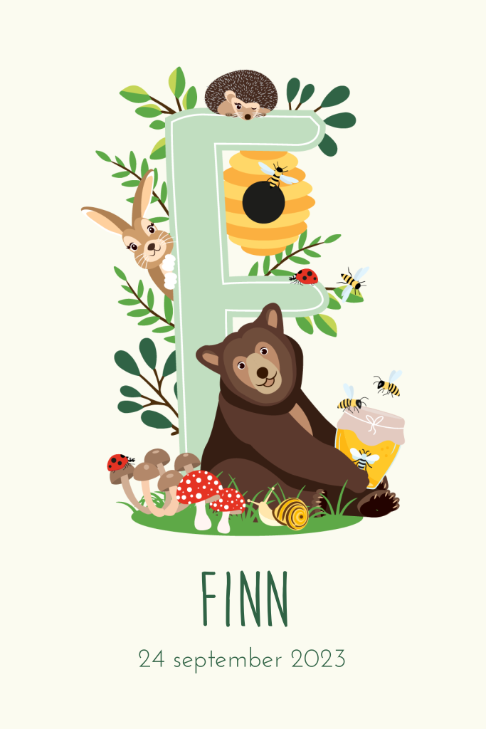 Geboortekaartje met bosdieren voor een jongen met de letter f. Dit kaartje kan met elke letter op aanvraag worden gemaakt. (3664)