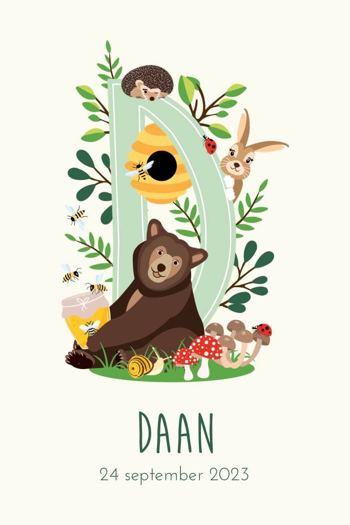 Geboortekaartje met bosdieren voor een jongen met de letter d van het alfabet. (3662) Dit kaartje kan met elke letter op aanvraag worden gemaakt. Neem gerust even contact op met onze klantenservice.