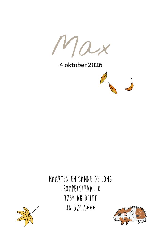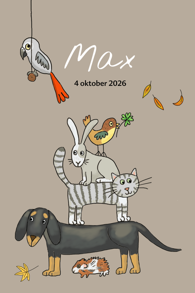 Een hip en vrolijk geboortekaartje voor een jongen met huisdieren en herfstbladeren. (3294)