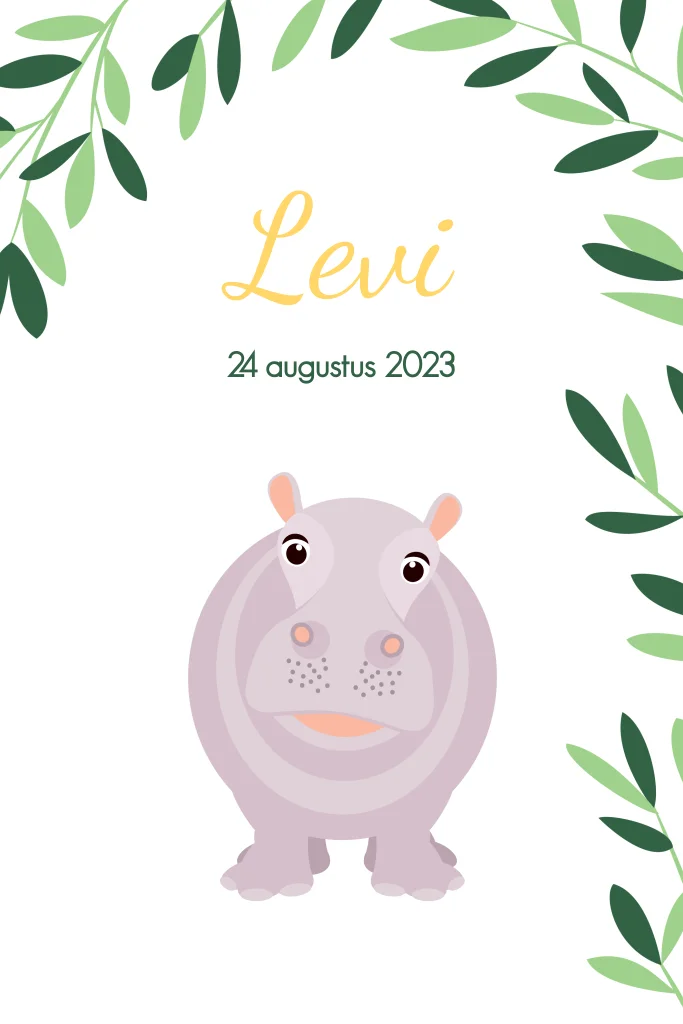 Vrolijk geboortekaartje met nijlpaard voor een jongen. (3680)