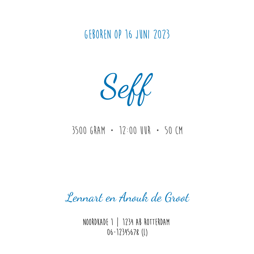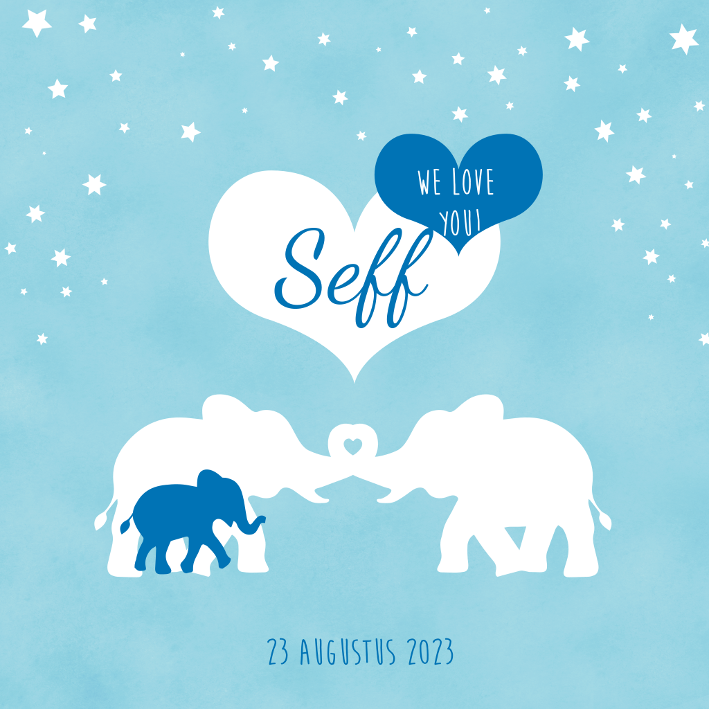 Een kleine jongen is geboren! Wat is het dan leuk om een origineel geboortekaartje met dieren te sturen. Dit kaartje laat papa en mama olifant zien die met hun slurven een hartje vormen en een babyolifantje in donker blauw die het baby'tje is. De olifanten staan onder een prachtige sterrenhemel en in het hart schrijf je de naam van je baby.