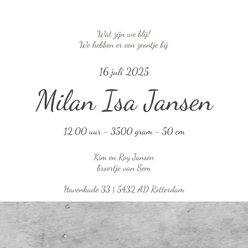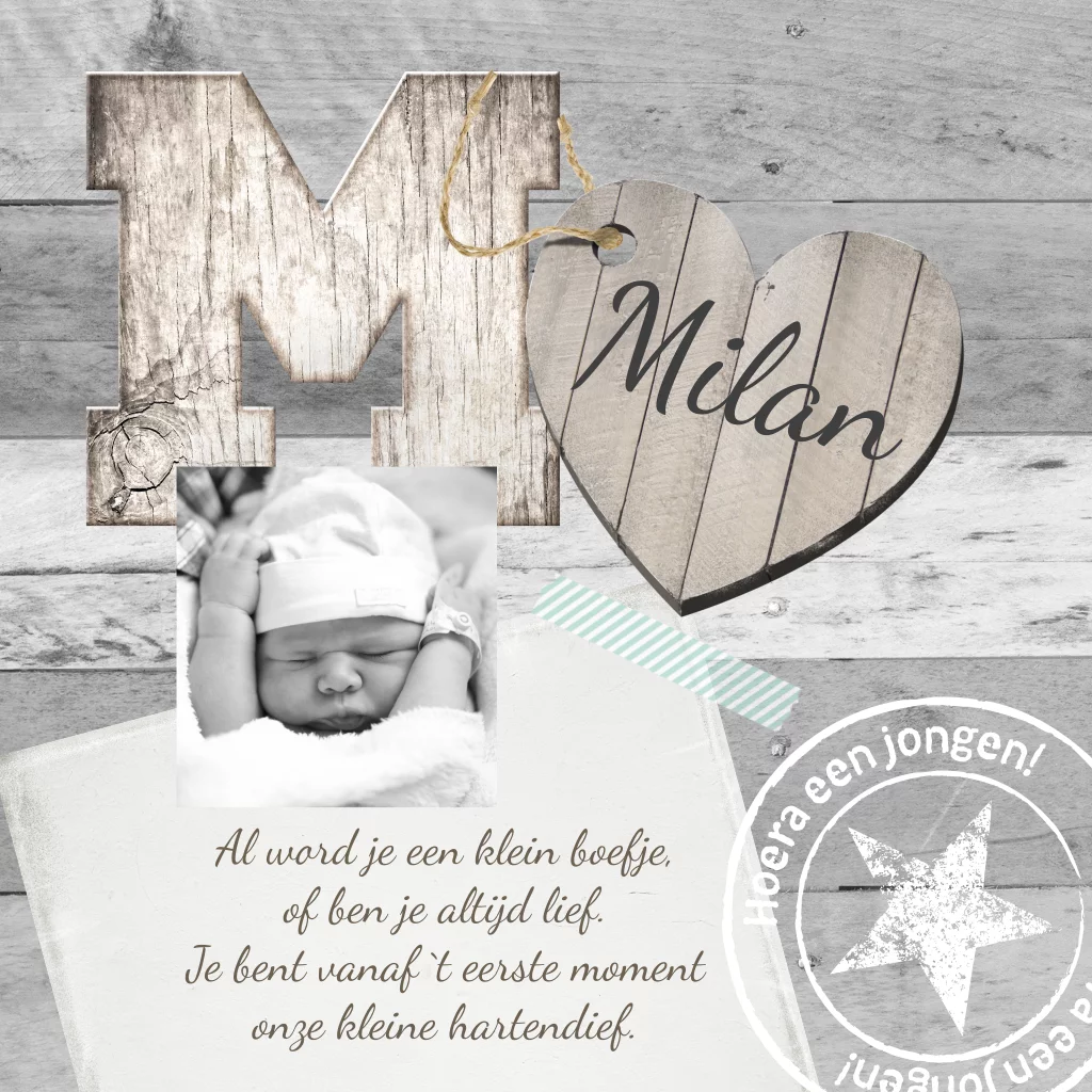 Origineel scrapbook geboortekaartje met stempel, houten hart, een memoblaadje, tape een foto en iets heel leuks: de eerste letter van de naam van jouw jongetje. Echt uniek! Zo werkt het vervangen van de houtlook letter kies bij afbeeldingen bij 'letters - hout' de letter uit die jij nodig hebt en plaats deze op het kaartje. Lukt het niet? Neem dan contact met ons op.