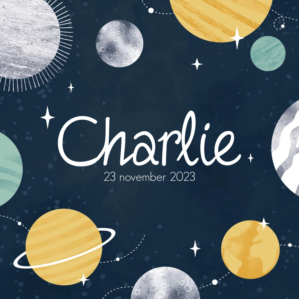 Geboortekaartje planeten en sterren geel groen