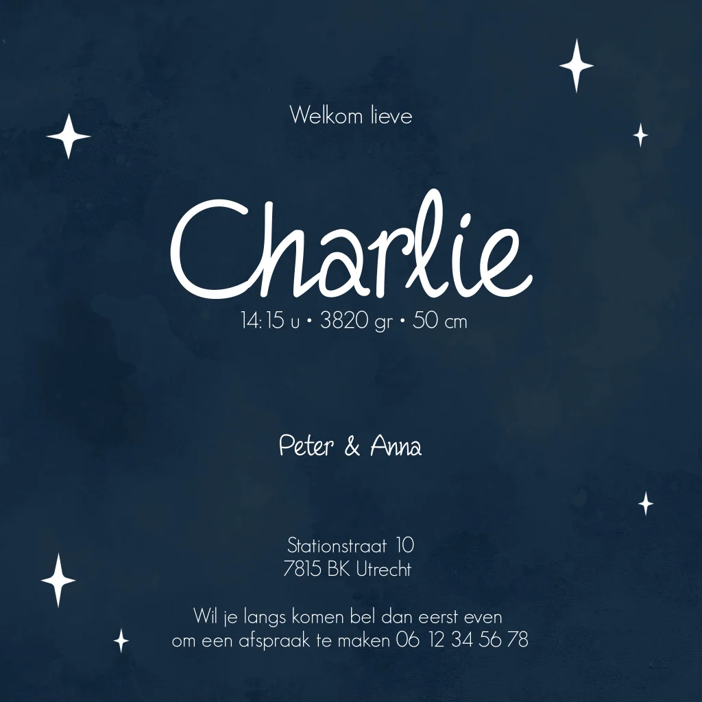 Geboortekaartje leuk voor een jongen of meisje, met ruimte thema. Planeten en sterren in het geel groen en wit op een donker blauwe achtergrond. (3261)