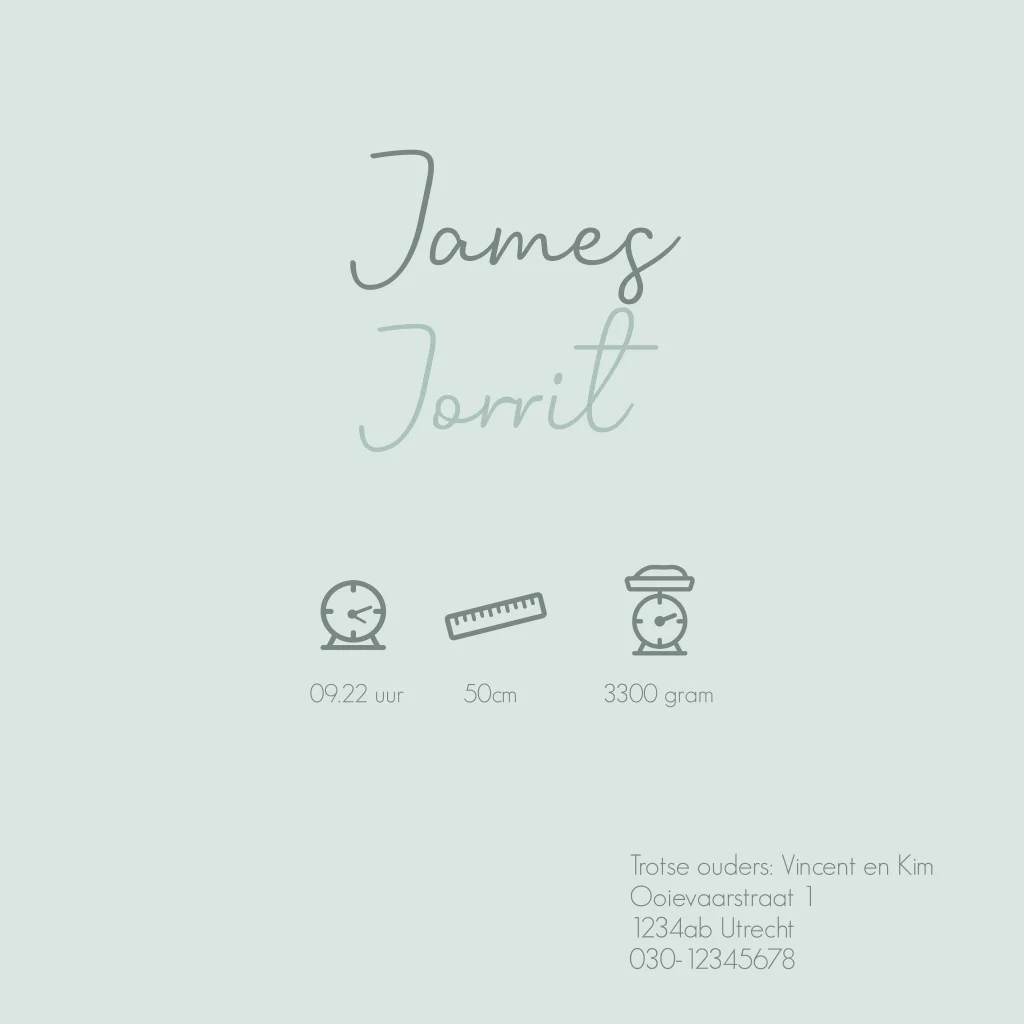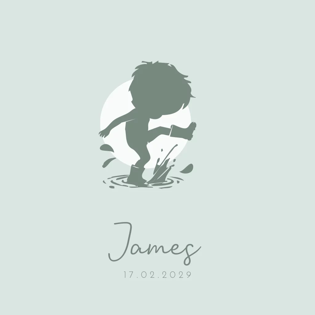 Grappig geboortekaartje met een jongen die in de plassen stampt