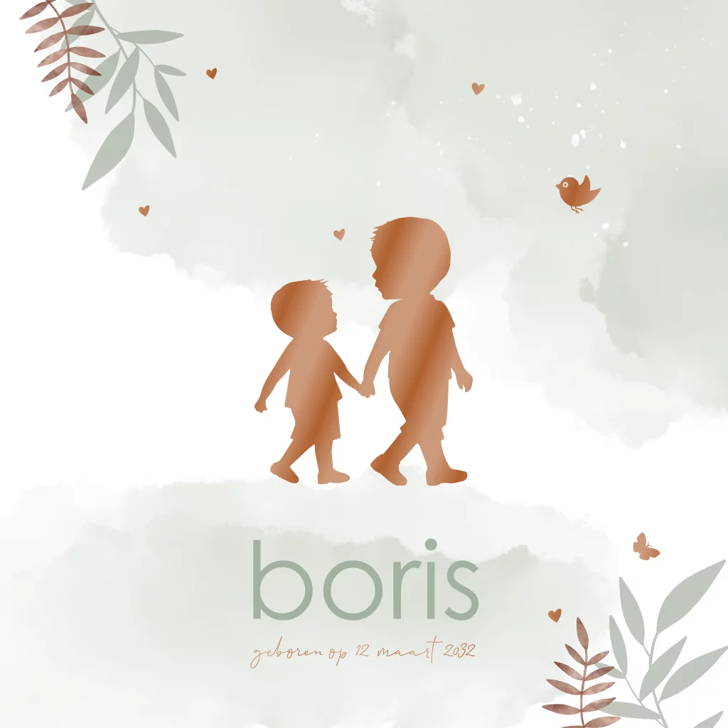 Geboortekaartje silhouette broertjes met hartjes en koper hoogglans lak.