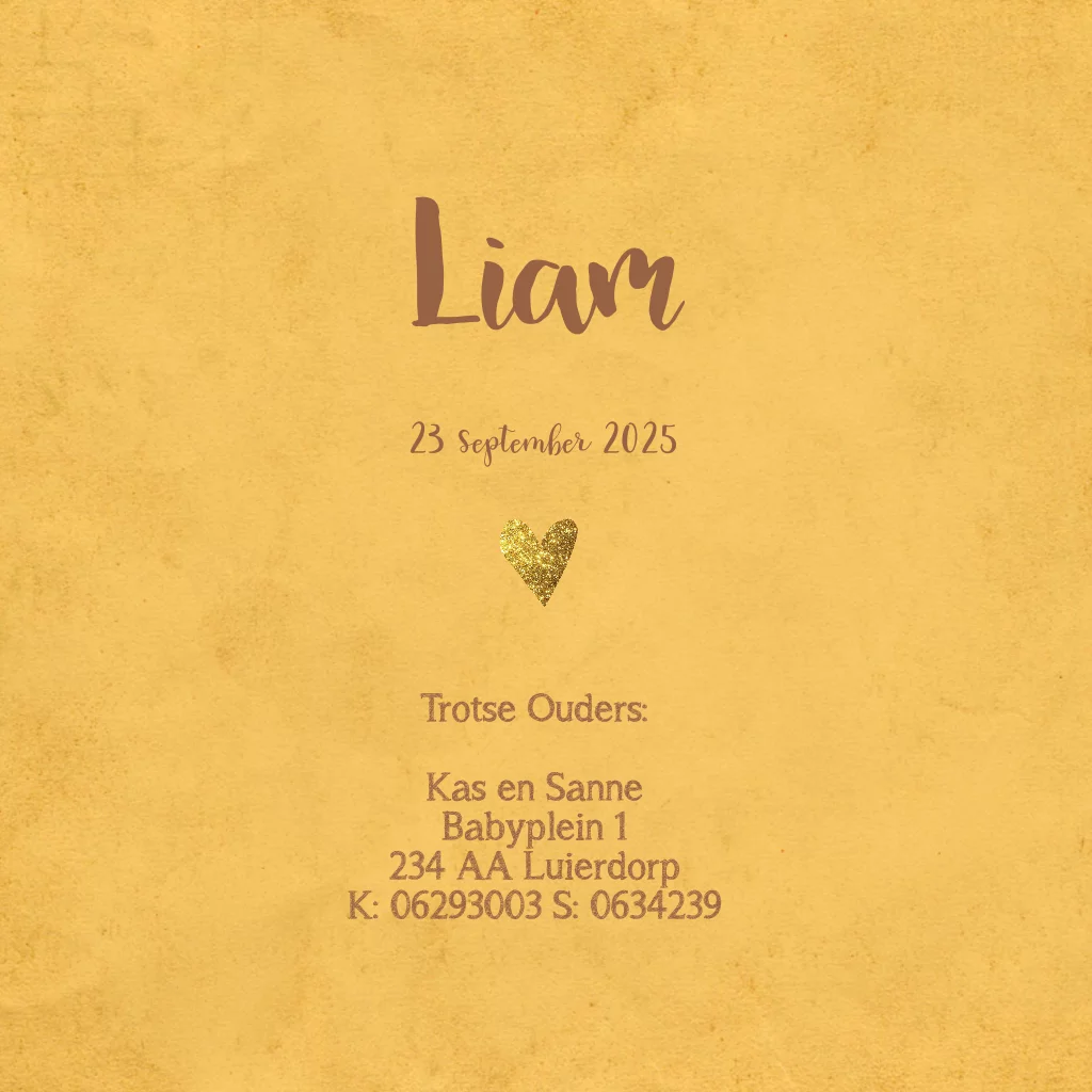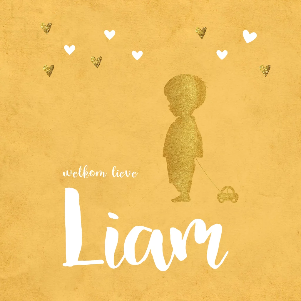 Maak deze geboortekaart voor jullie mooie jongetje met lieve goud-look hartjes en gouden-look silhouette. Kleur geel De achtergrondkleur is naar wens aan te passen (141)