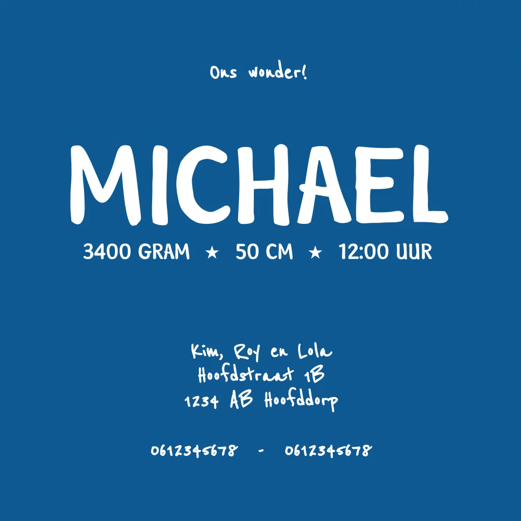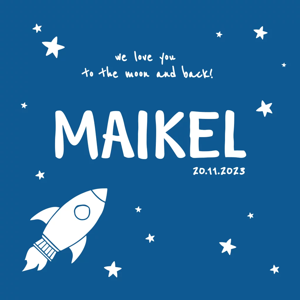 Voor de geboorte van een stoere zoon zoek je een modern geboortekaartje met leuke sterren en een hip raket. Dit geboortekaartjes is stoer en duidelijk: de naam van het jongetje staat prachtig op de blauwe achtergrond.