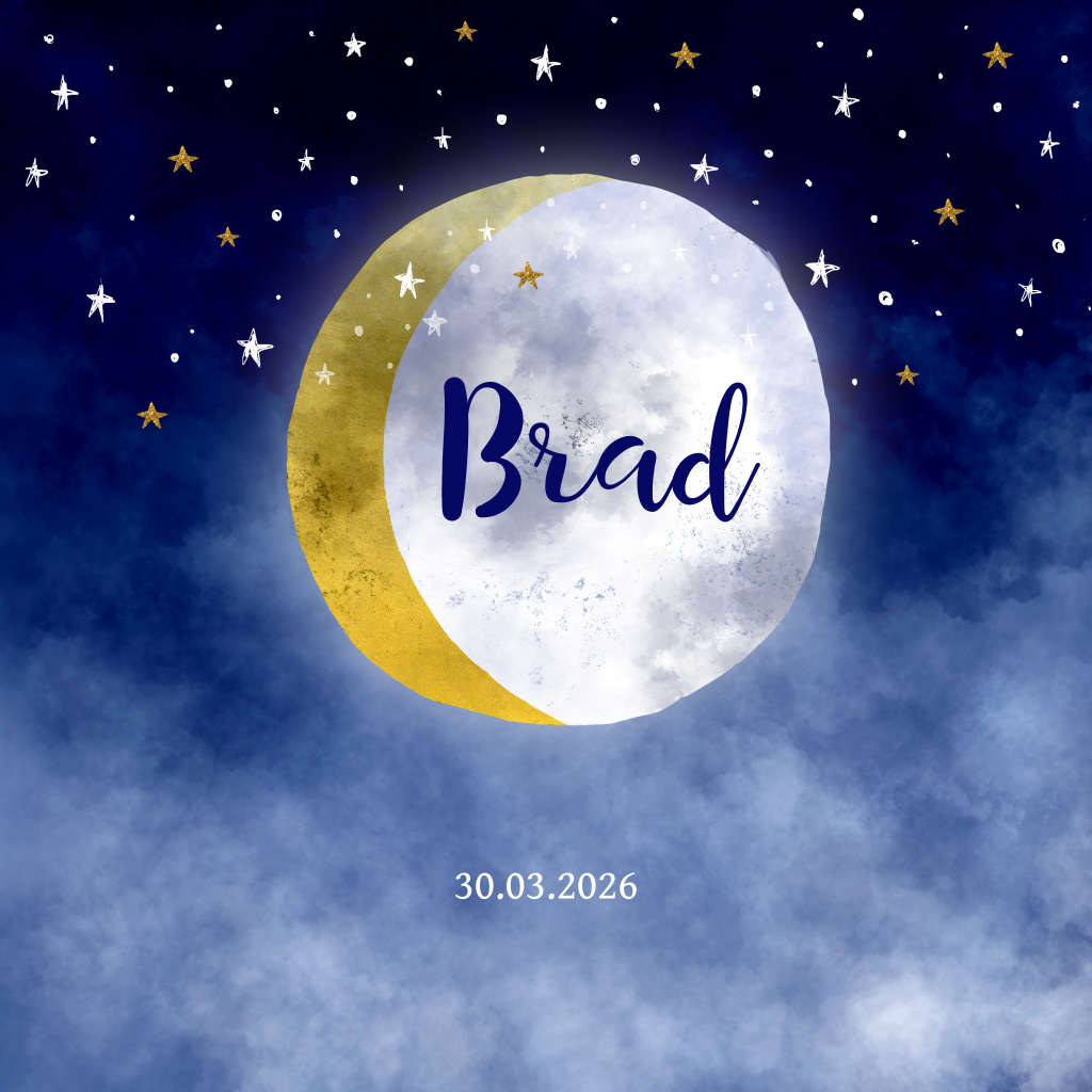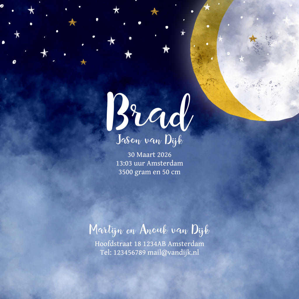 Een hip geboortekaartje met sterren en maan voor een jongen. Pas zelf de teksten aan. (4609)