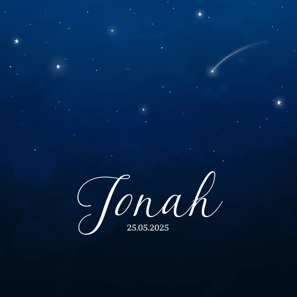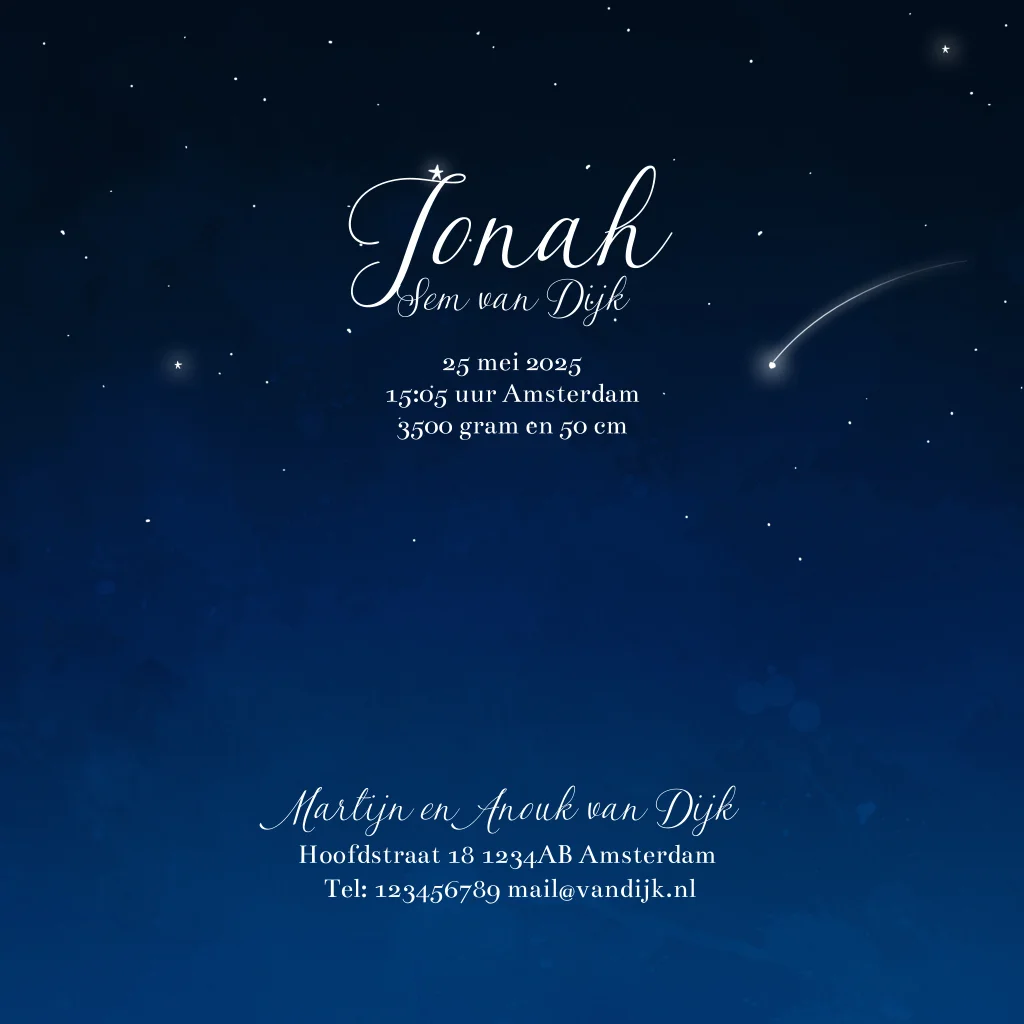 Een stijlvol en hip geboortekaartje met een sterrenhemel. Pas zelf de teksten aan. (237)