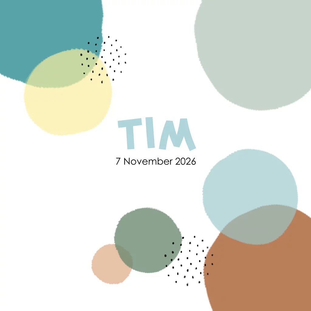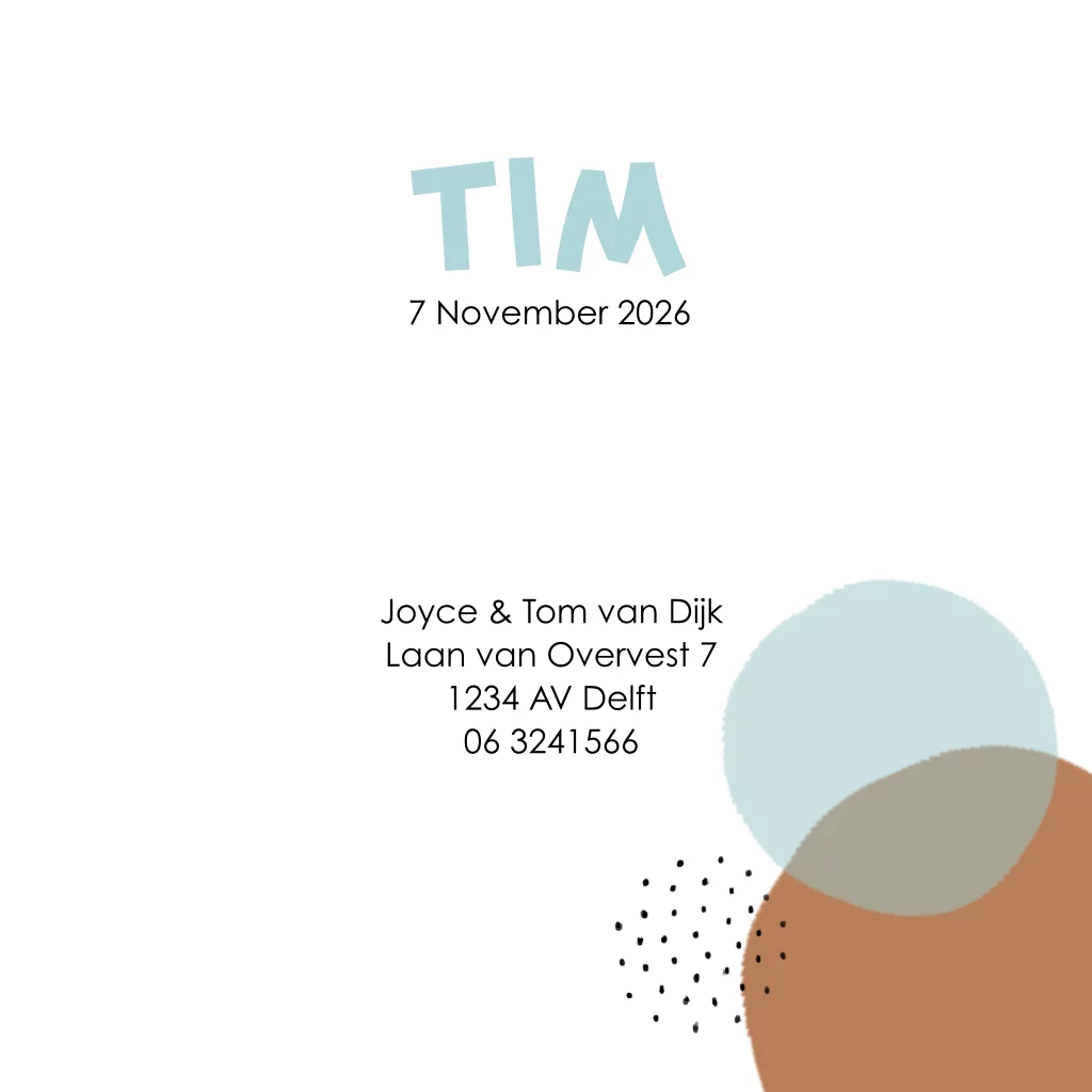 Een hip grafisch geboortekaartje met gekleurde stippen in blauw, groen geel en bruin voor een jongen. (3302)