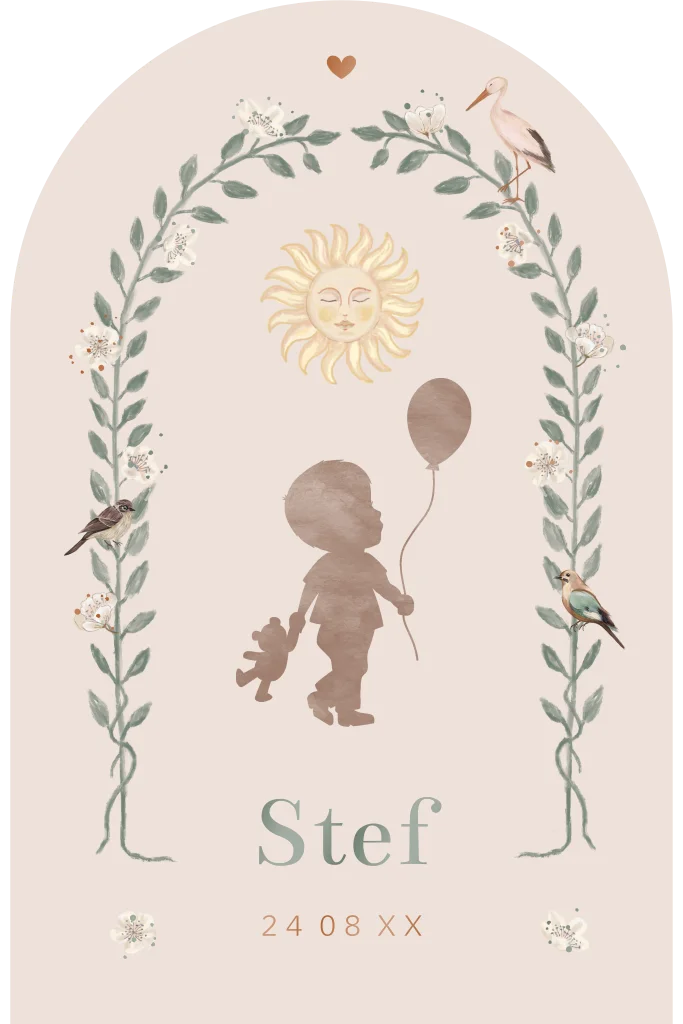 Prachtig arch-vorm boho jongenskaartje met blaadjes, vogeltjes, een zon, een ooievaar en een schattig waterverf silhouet van een jongetje. De naam en geboortedatum en kleine stipjes zijn hier gedrukt met hoogglans inkt.