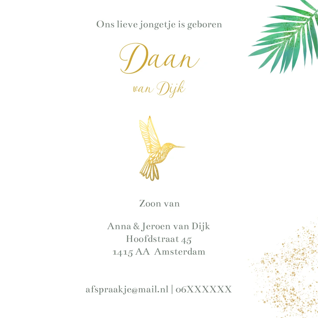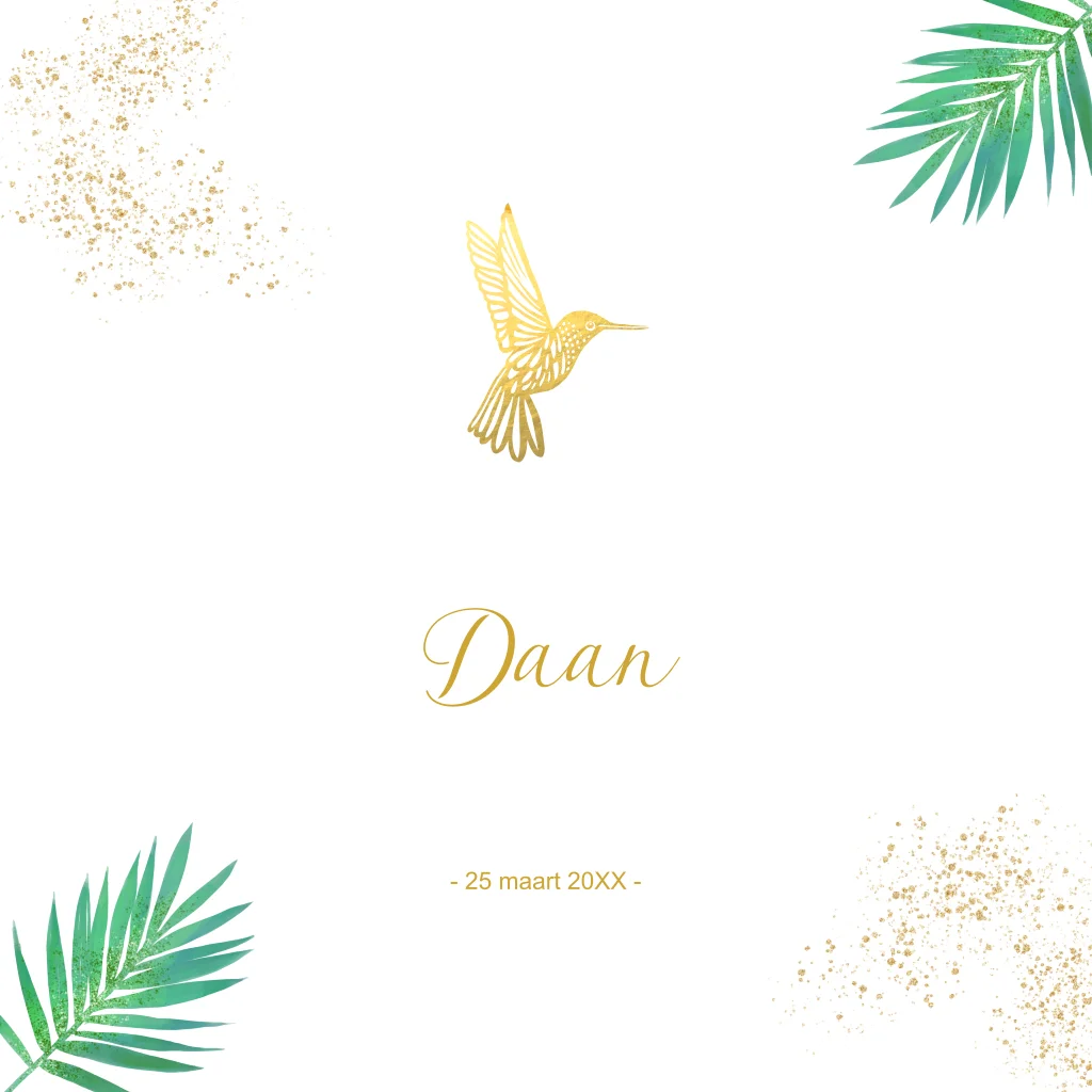 Geboorte voor een jongetje met vogeltje in goudkleur met tropisch blad. (3413)
