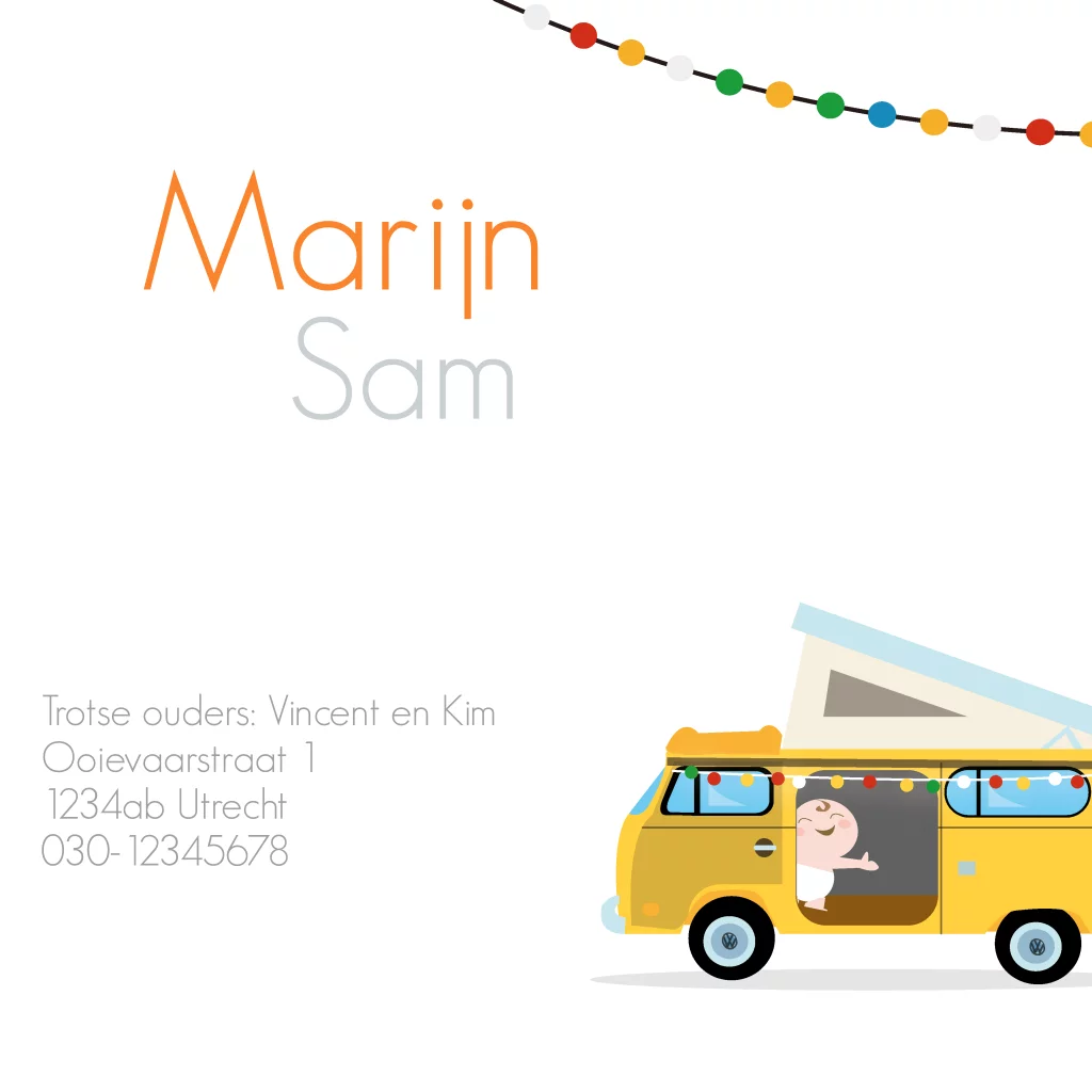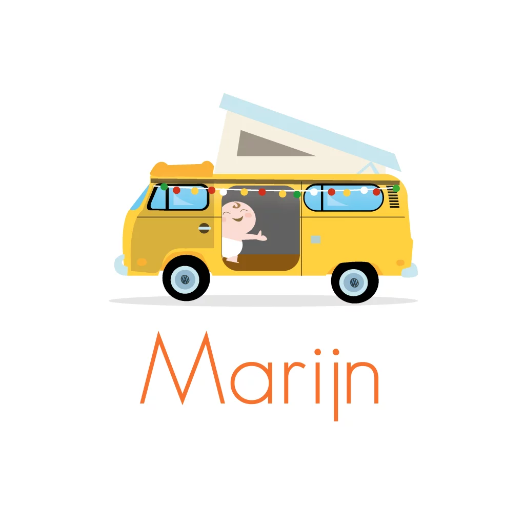 stoere geboortekaartjes voor ouders die van kamperen houden. Met een getekende baby in een vintage Westfalia volkswagenbusje busje. (3307)
