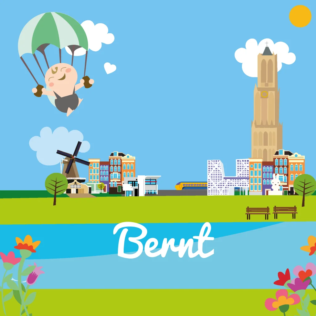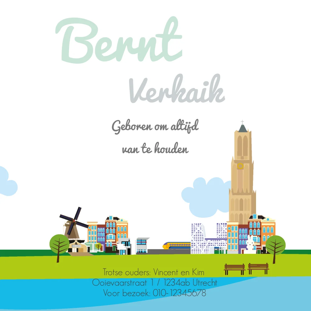 Vrolijk geboortekaartje voor een jongetje dat in Utrecht geboren is. Met de skyline van Utrecht met onder andere de Dom, het stadskantoor, Molen de Ster, het Rietveldhuis en het Nijntje pleintje. (3230)