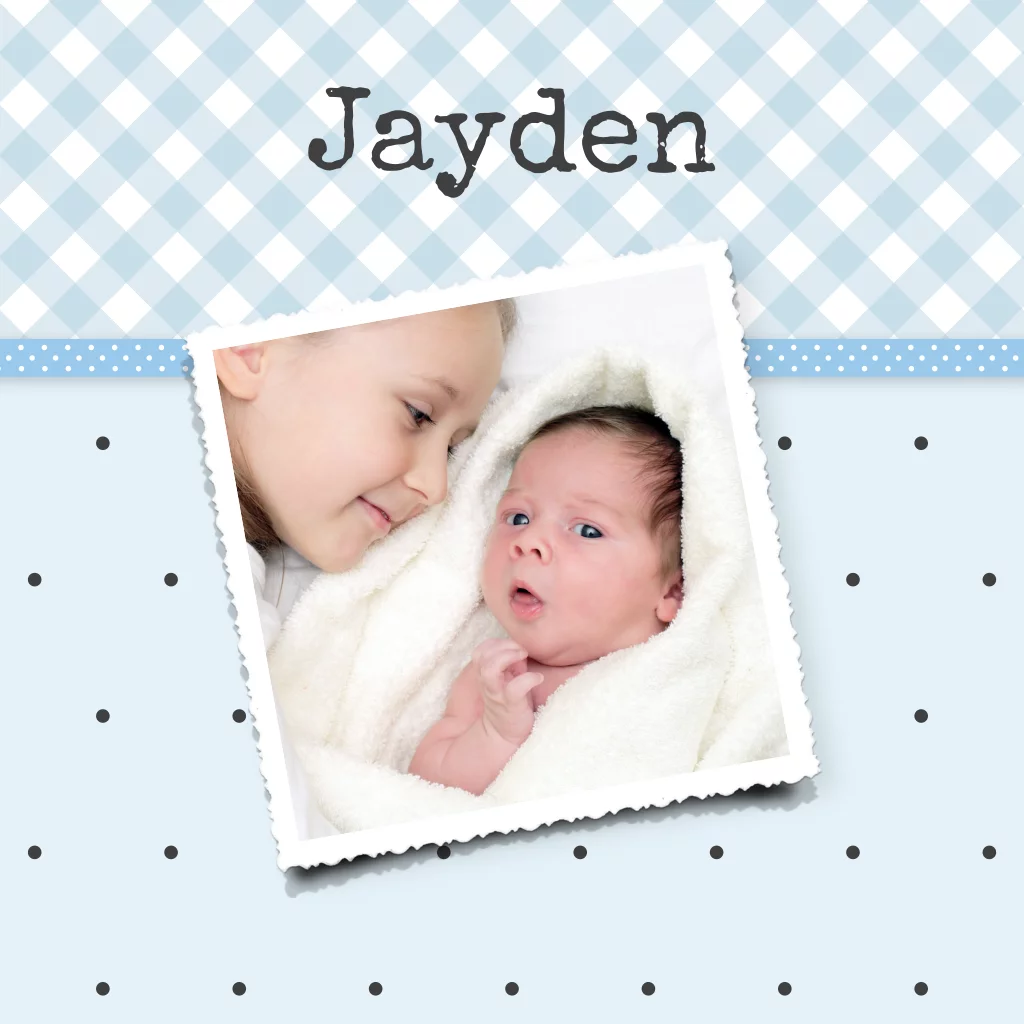 Klassieke geboortekaart met stippen en ruitjes voor een jongen. De foto van voetjes op de voorkant is echt speciaal. Je kunt deze foto vervangen door een eigen foto, of de voetjes laten staan.