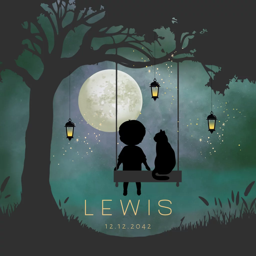 Geboortekaartje met een silhouet van een jongetje samen met een poes op een schommel. Met een maan, sterretjes en lampjes.