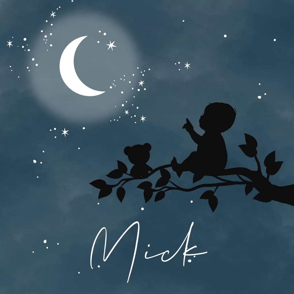 Geboortekaartje voor een jongetje. Met een silhouet van een jongen met een beertje op tak met maan en sterretjes.