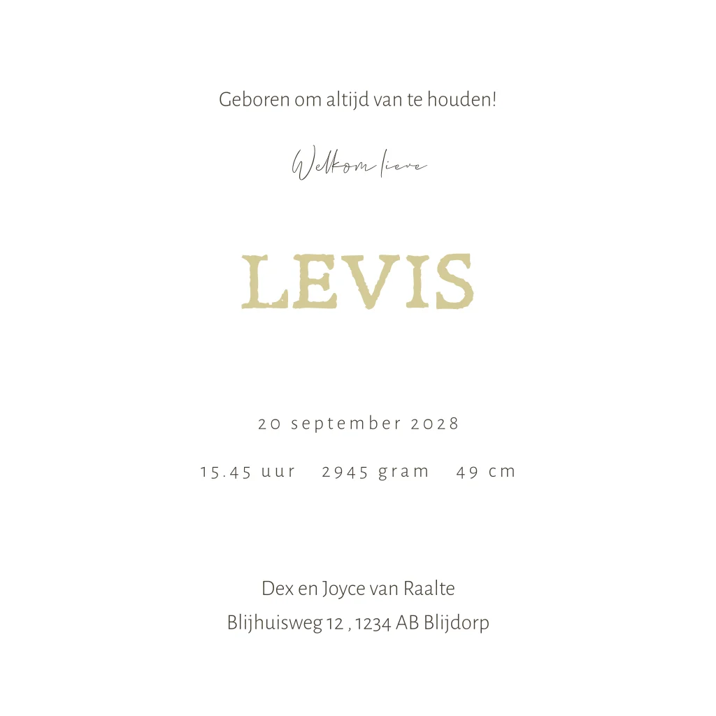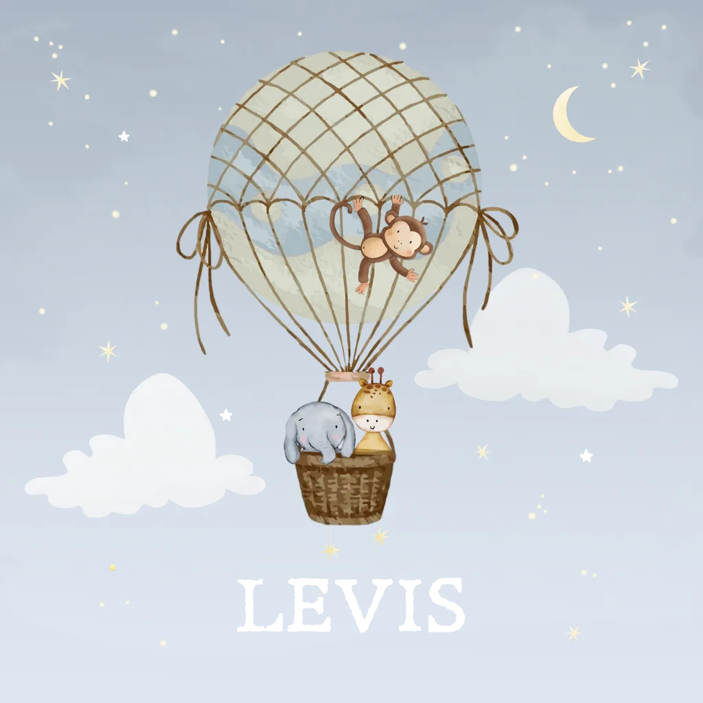 Een schattig geboortekaartje voor een jongen met een speels aapje dat aan de luchtballon hangt, terwijl de olifant en giraf gezellig in het mandje zitten. Het zachte kleurenpalet en luchtige ontwerp geven een warme, vrolijke uitstraling. Bewerk dit lieve kaartje eenvoudig zelf in onze online editor.