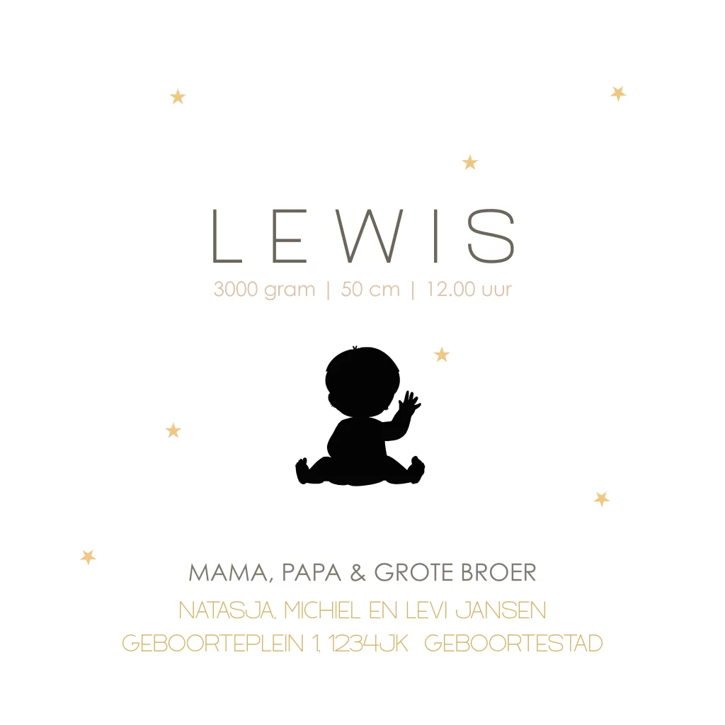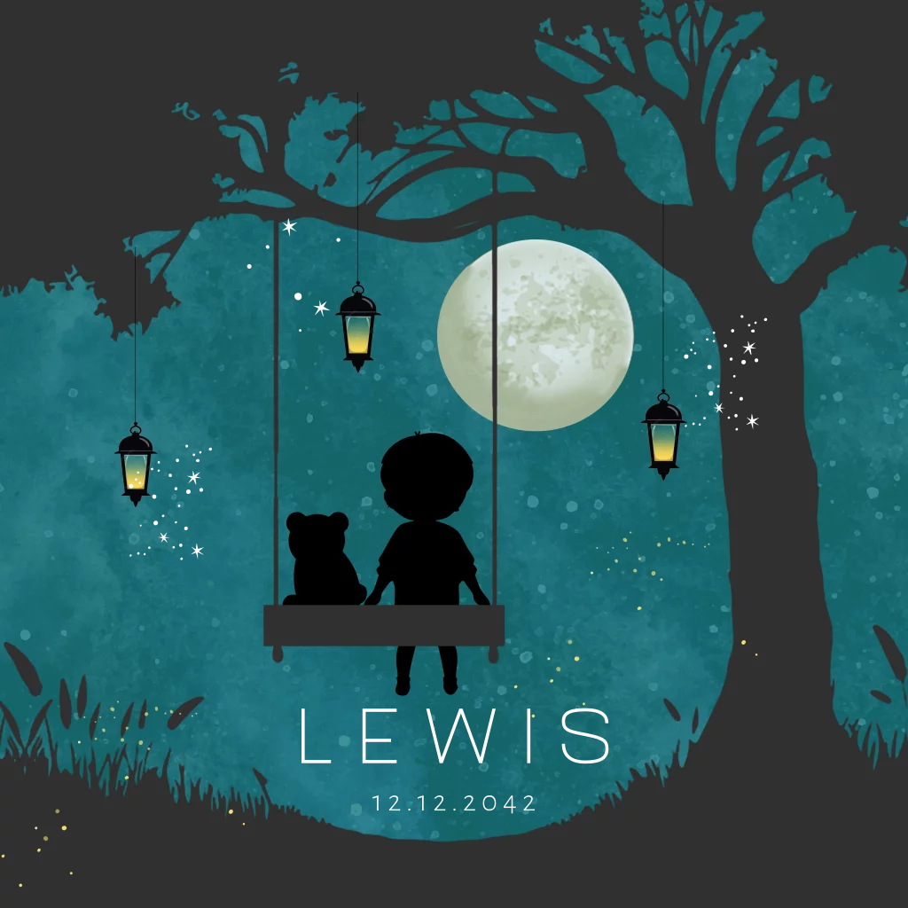 Geboortekaartje voor een jongen met kindje op schommel samen met een beertje. Een maan, sterretjes en lampen.