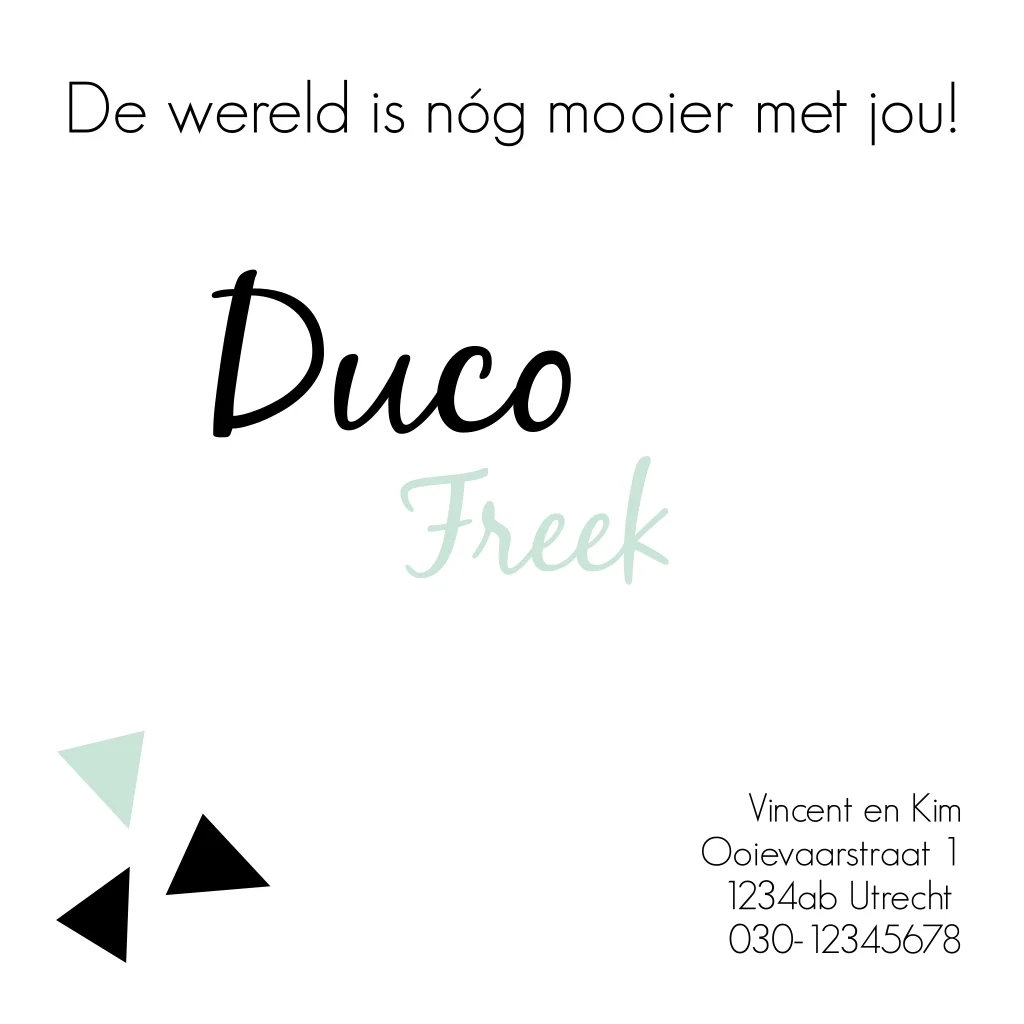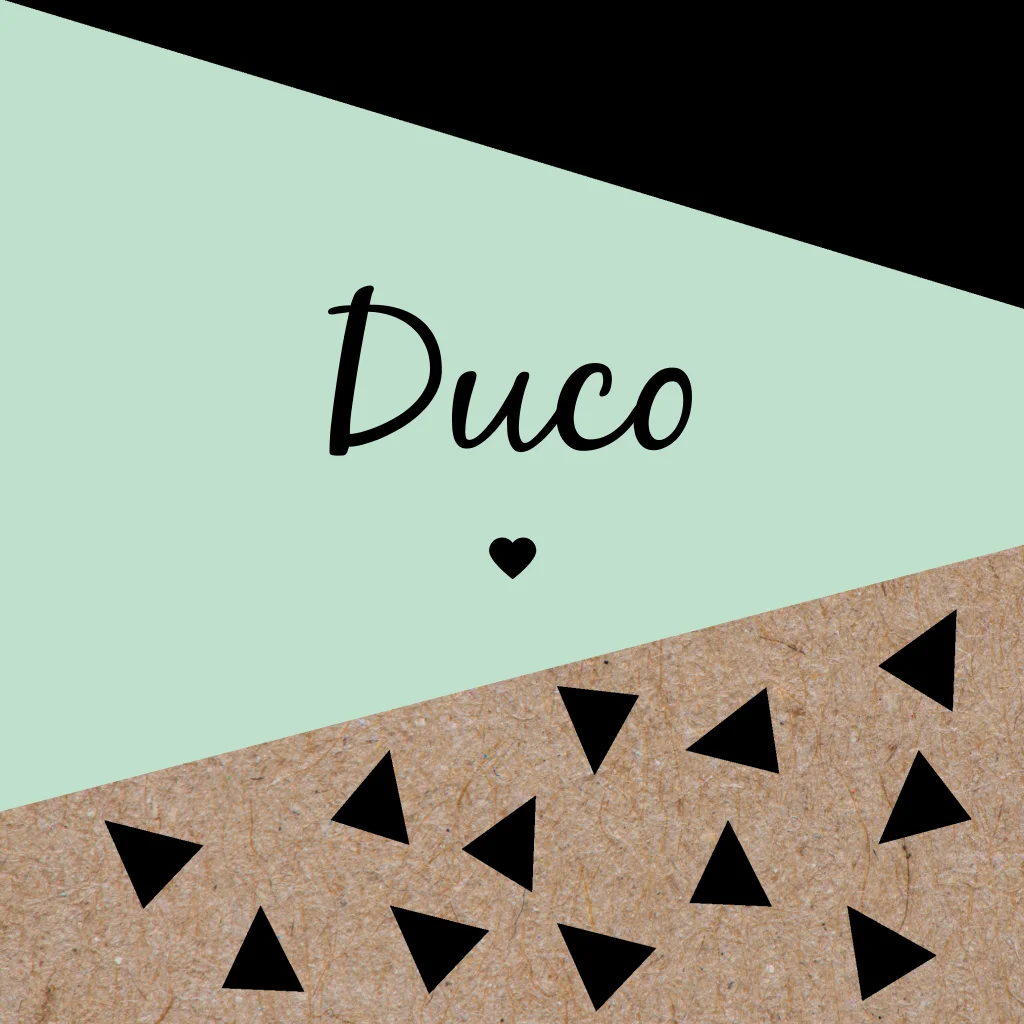 Modern geometrisch langwerpig geboortekaartje voor een jongen met driehoekjes, kraft en hartje. (3318)