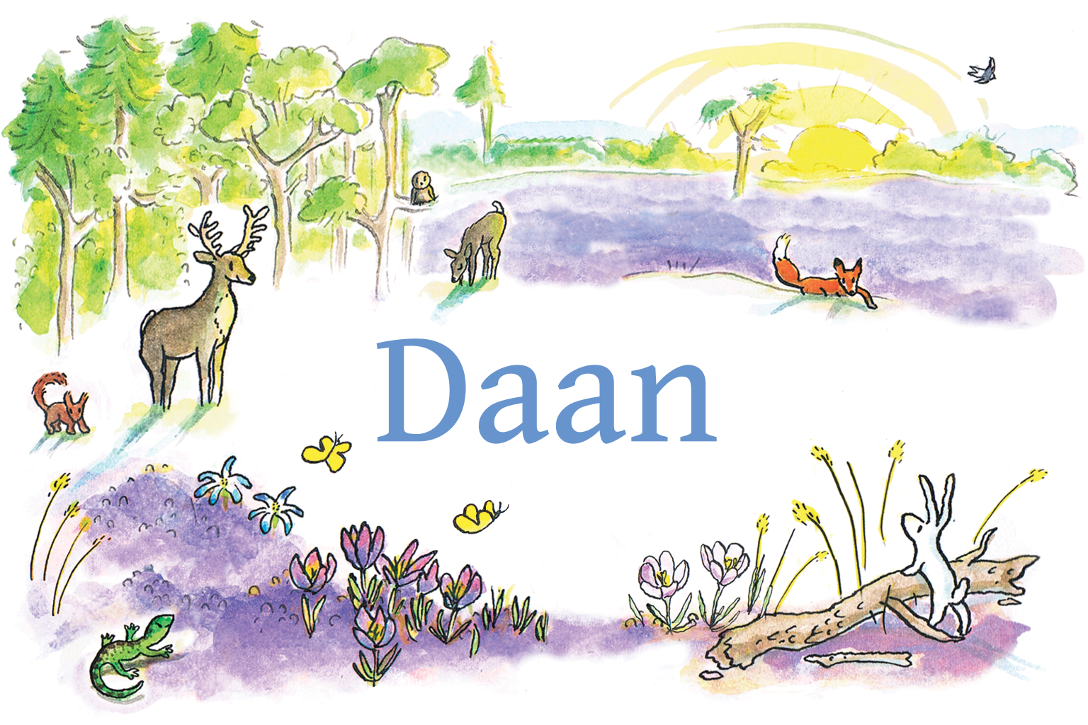 Getekend geboortekaartje voor jongen. Natuurlijk Heidelandschap met dieren. Vosje, konijn, hertjes, zwijntjes en een uil. (3663)