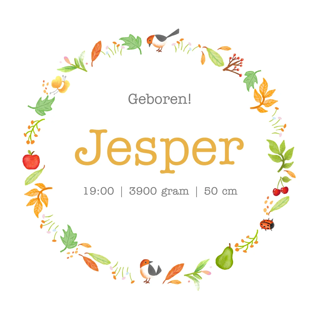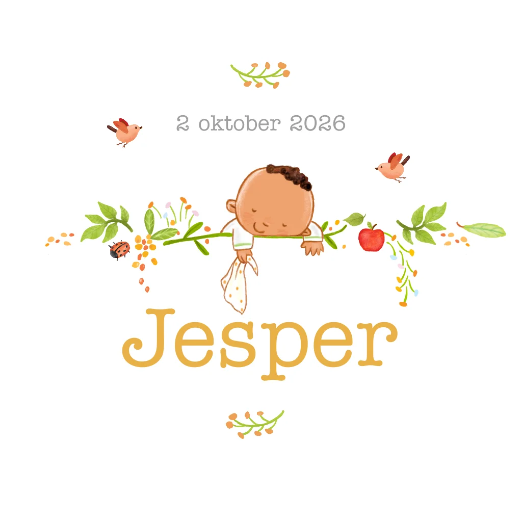 Lief getekend geboortekaartje voor een jongetje hangend over takje met lieveheersbeestjes en vogels. (4514)