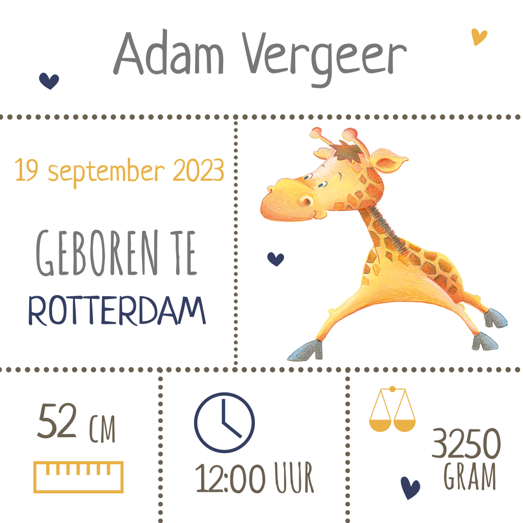 Wat een grappige geboortekaart met een grappige giraffe. Je wordt echt vrolijk van deze babykaart. De verschillende kleuren en de gezellige hartjes... Echt een feestje!