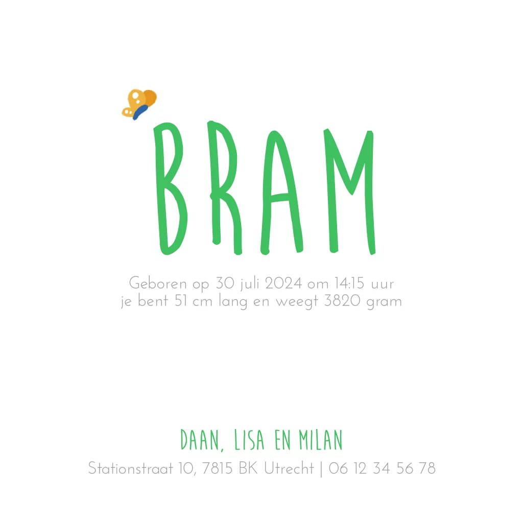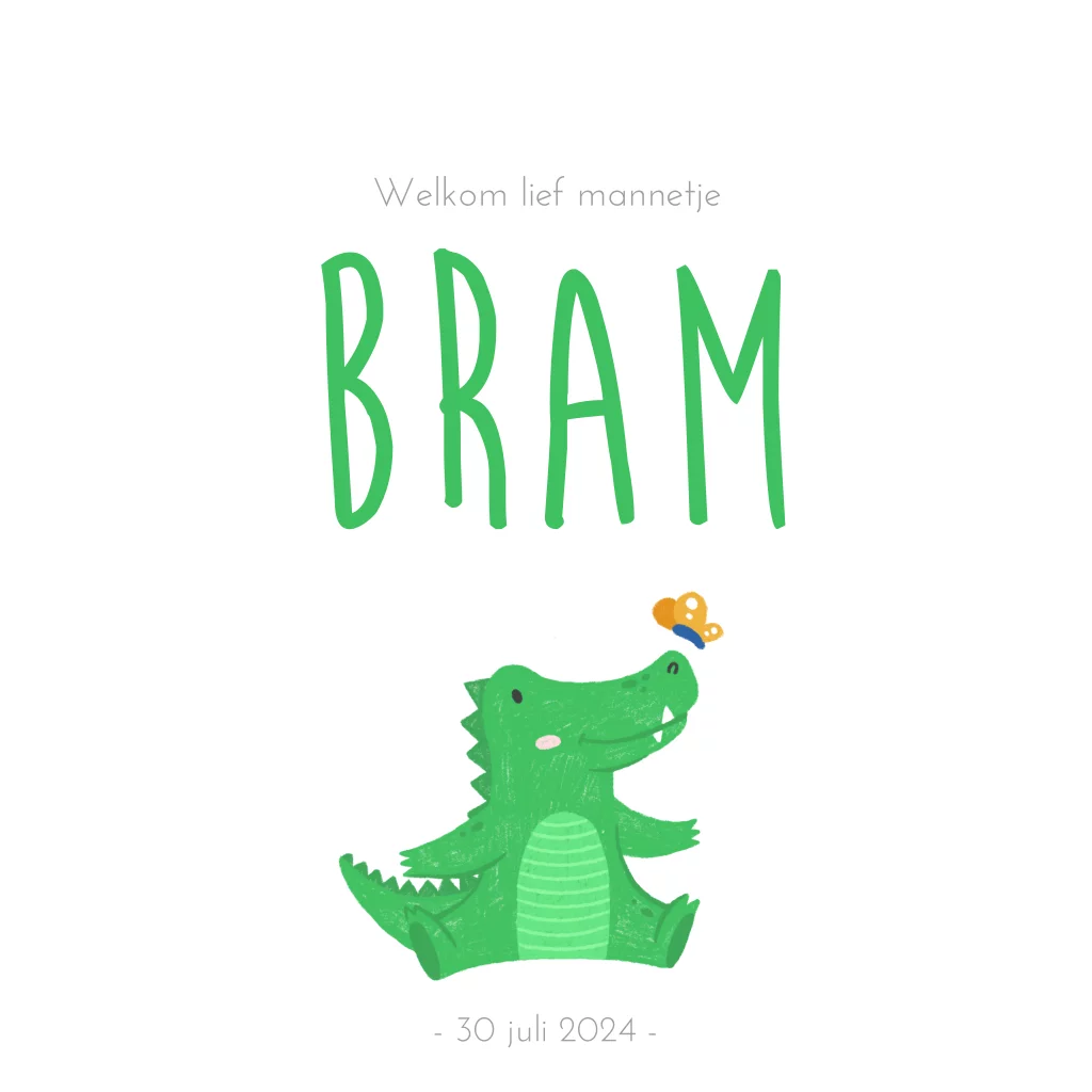 Stoer en lief geboortekaartje in groene tinten voor een jongen. Met een getekende krokodil en vlindertjes. Alle elementen op de kaart zijn los en naar wens aan te passen. (3558)