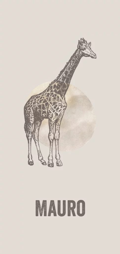 Hip jongens geboortekaartje met een giraf en aardetinten.