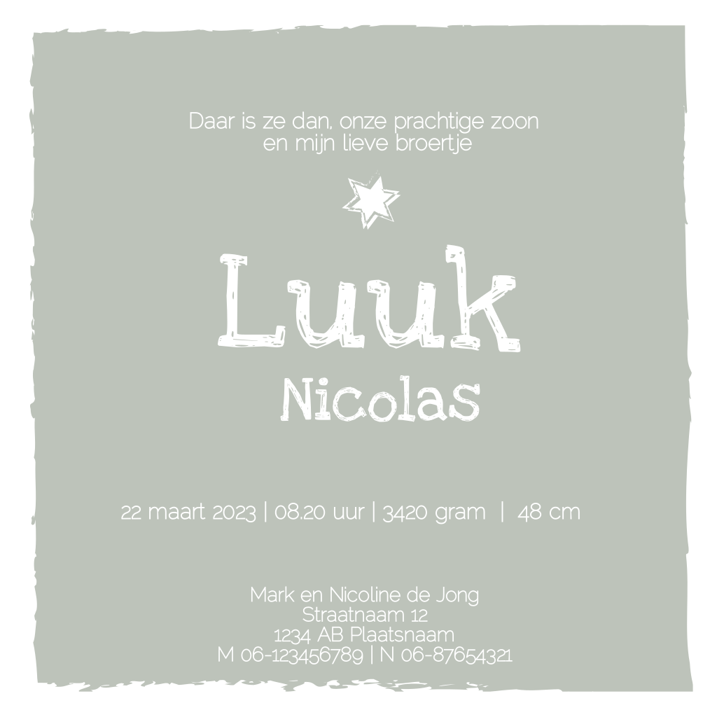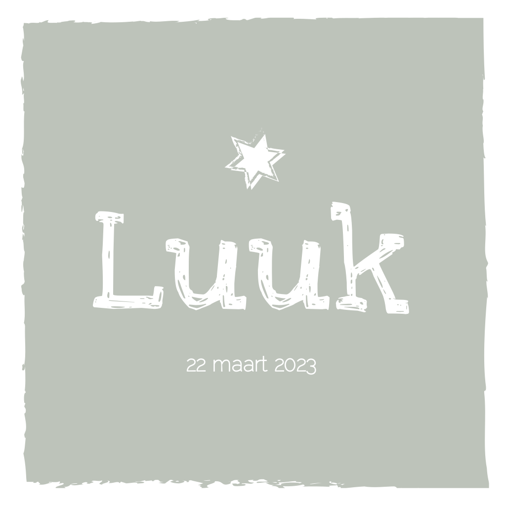 Hip geboortekaartje in de kleur van het jaar 2020 'Tranquil Dawn' midden tussen groen, blauw en grijs. (3677)