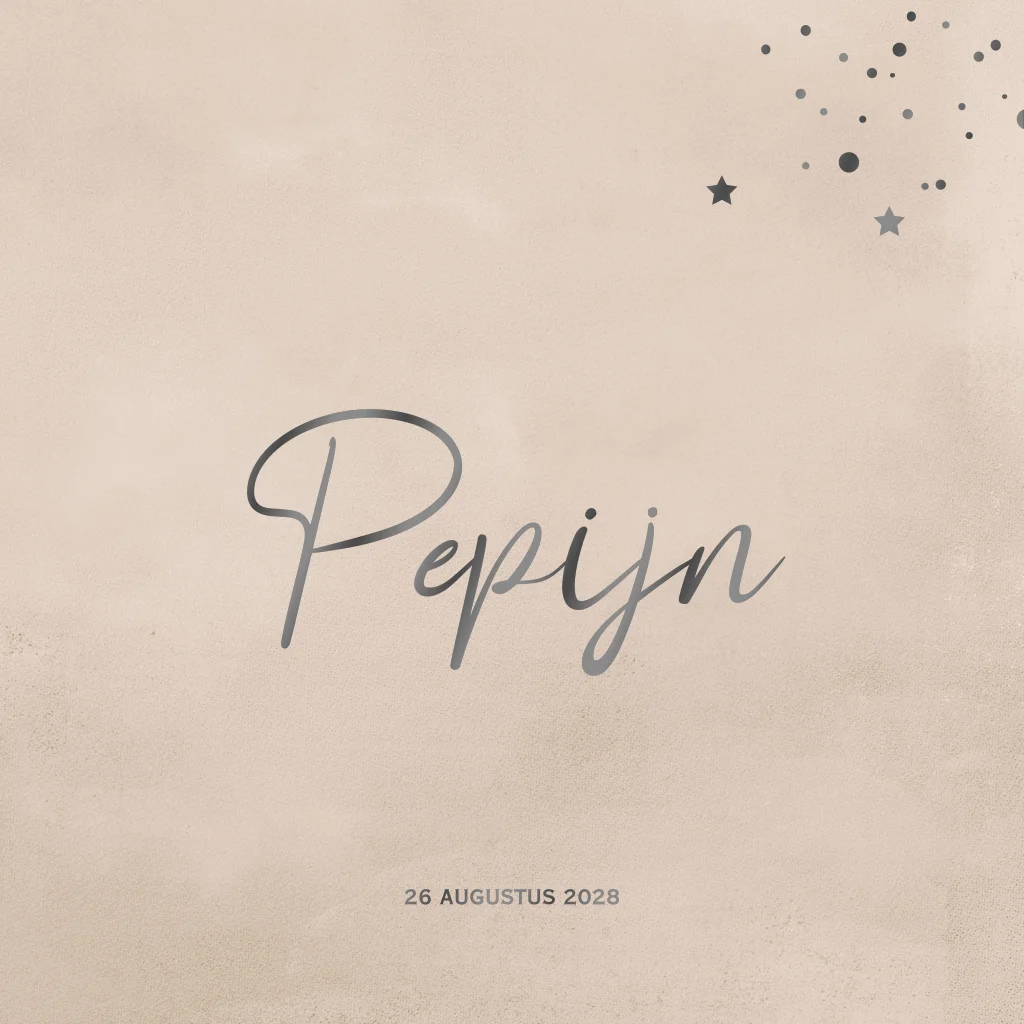 Geboortekaartje hip voor een jongetje met foliedruk en zandkleurige achtergrond.