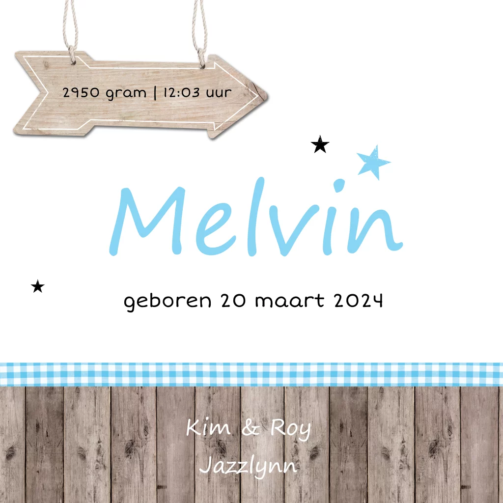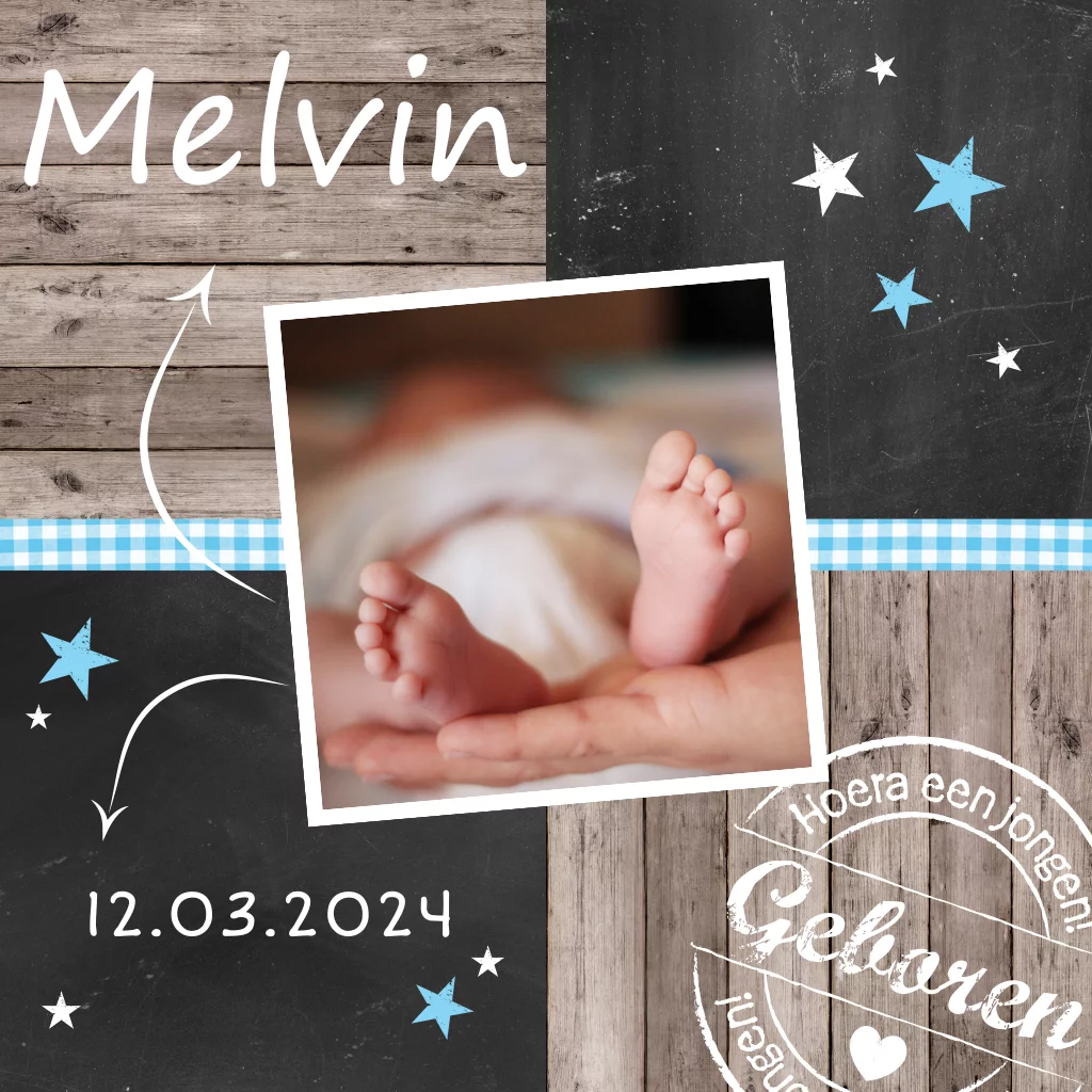 Vrolijke geboortekaart met hout en krijtbord voor jongen