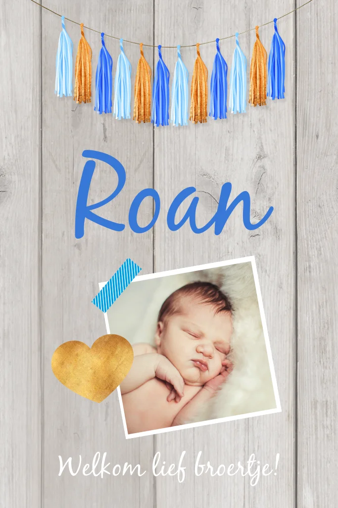 Stoer geboortekaartje voor een jongen met houten achtergrond, vrolijke slinger en foto.