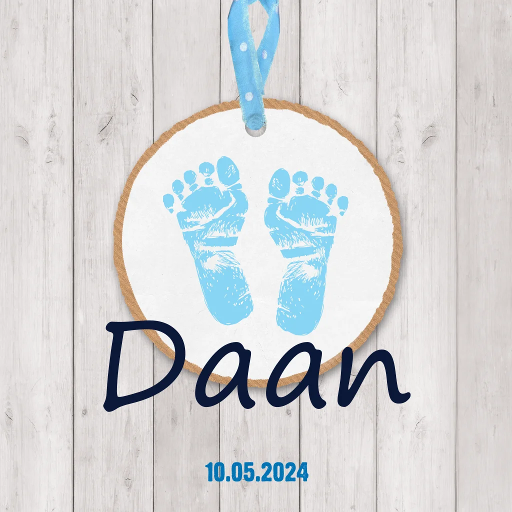 Uniek geboortekaartje met afdruk van babyvoetjes op een label die met een lint aan de houten achtergrond vast zit. Bewerk de kaart om het persoonlijk te maken.