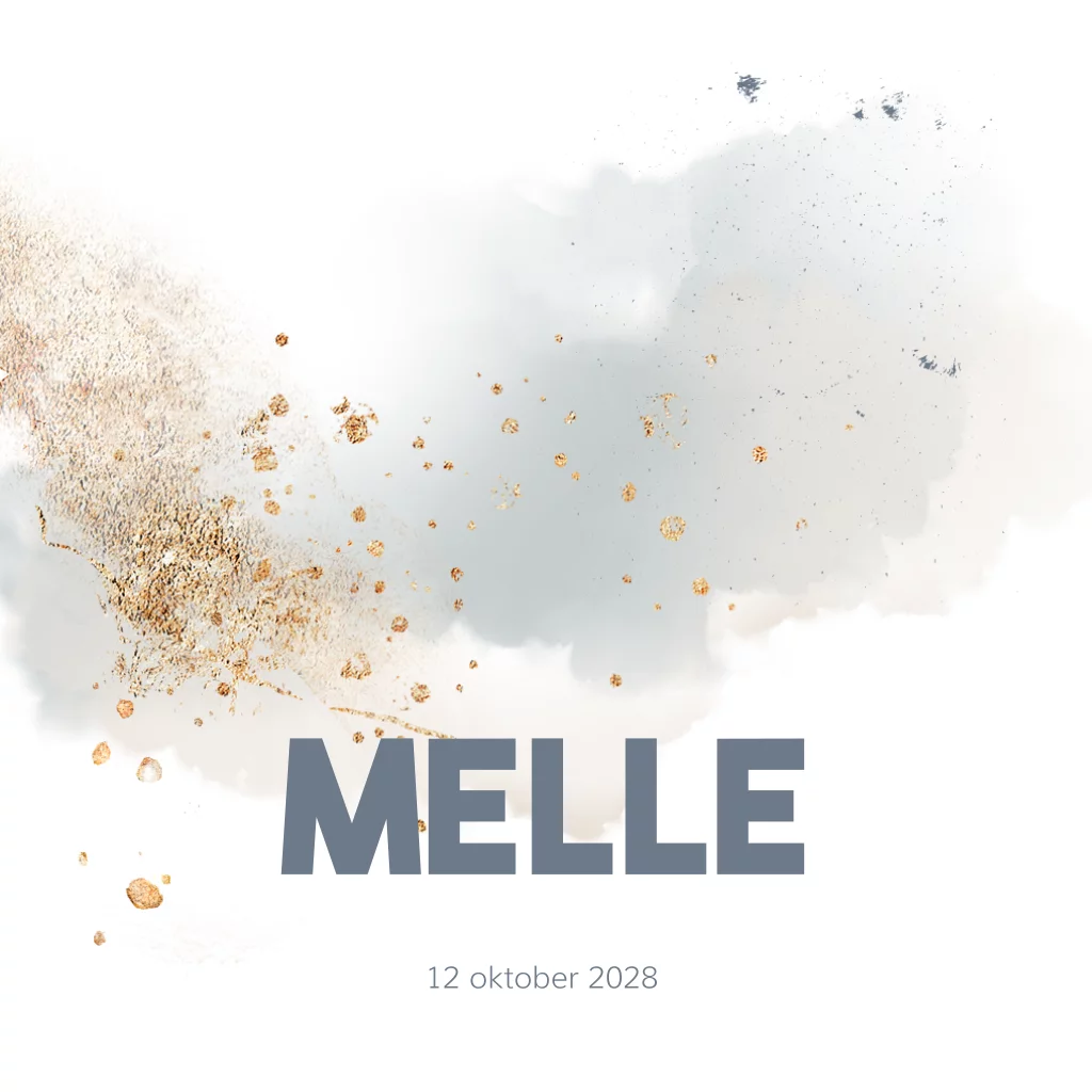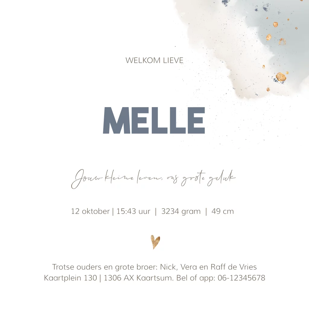 Hippe en stijlvolle geboortekaart voor een jongetje! Met moderne blauwe wolk in watercolor en goudfolie look verf spetters.