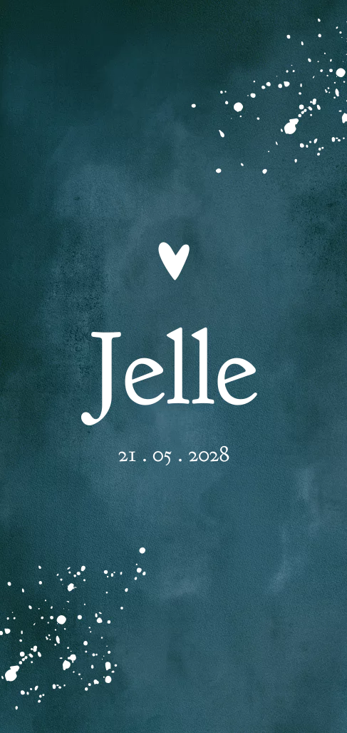 Jongens geboortekaartje met donkerblauwe velvet look en spetters in foliedruk. Pas de foliekleur naar keuze aan en bestel een proefdruk.